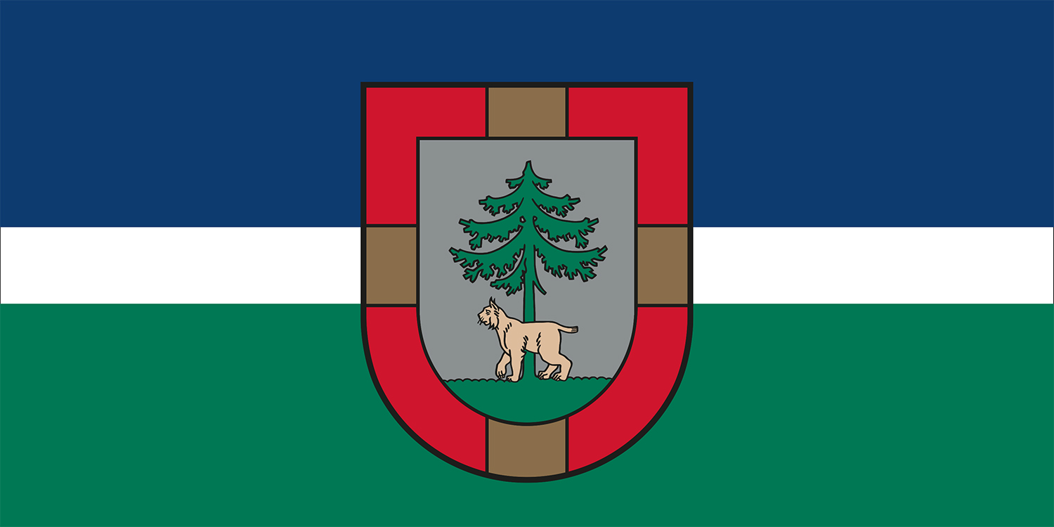 Green spruce tree on a same color base a in silver field, natural color lynx walking in front. Red border split by golden cross.