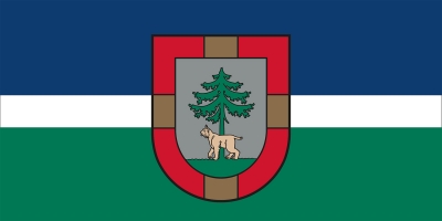 Coat of Arms of Jekabpils County on dark blue, white and green bacground.