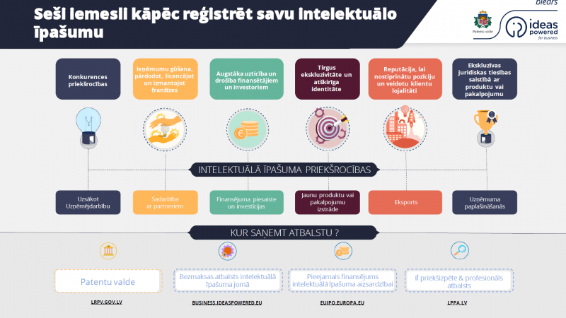 Daudzu plaši atpazīstamo uzņēmumu veiksmes pamatā ir to īpašnieku zināšanas un izpratne par intelektuālā īpašuma nozīmi un nepieciešamību to aizsargāt, lai garantētu savu produktu un pakalpojumu kvalitāti, savu reputāciju un lieki netērētu resursus cīņai ar negodprātīgiem uzņēmējiem. Tas ir iespējams, ja intelektuālā darba galarezultāts ir tiesiski aizsargāts. Latvijā šo procesu nodrošina Patentu valde, kas gan izglīto sabiedrību par intelektuālo īpašumu (IĪ), kā arī atbild par tajā ietilpstošo grupu – rūpnieciskā īpašuma objektu reģistrāciju kā preču zīmes, dizainparaugus, izgudrojumu patentus un pusvadītāju izstrādājumu topogrāfijas.