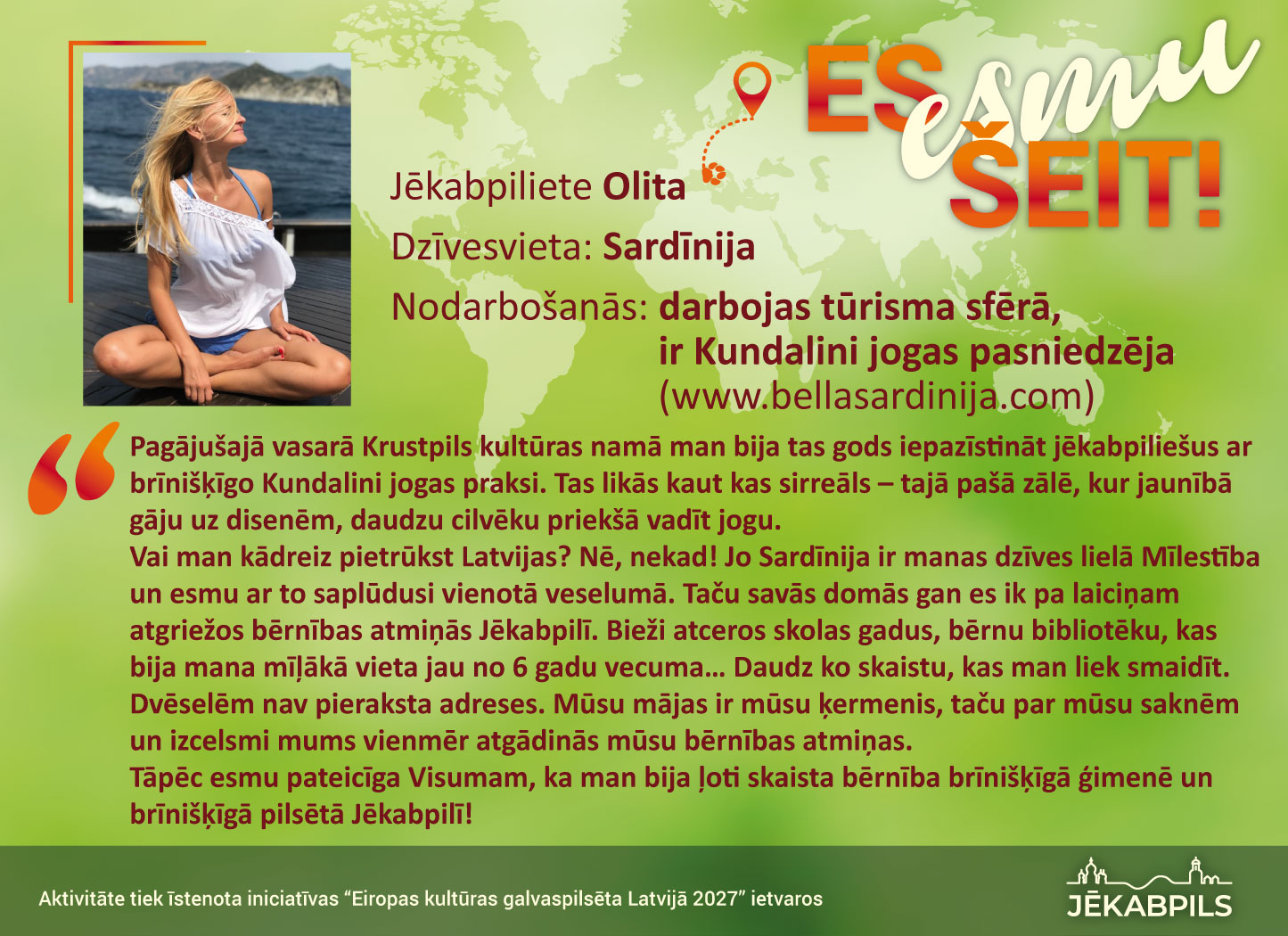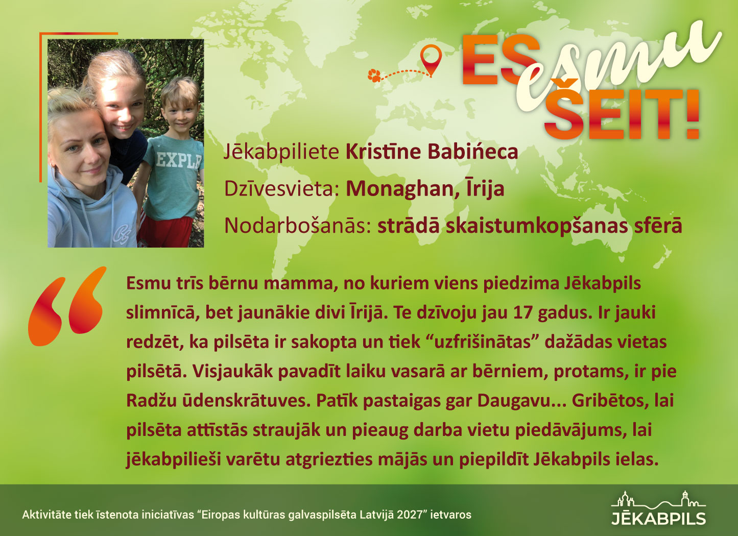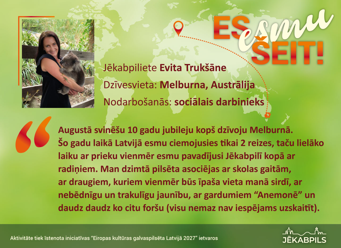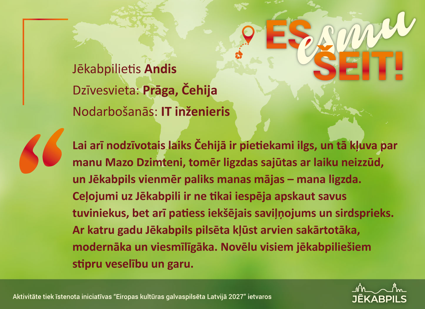Jēkabpils pilsētas pašvaldība iniciatīvas “Eiropas kultūras galvaspilsēta Latvijā 2027” ietvaros aprīlī izsludināja vispasaules jēkabpiliešu sasaukšanās akciju “Es esmu šeit!”
