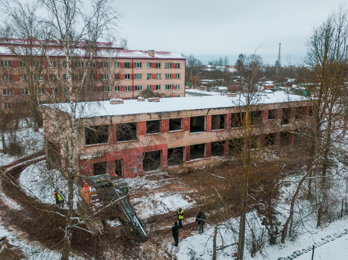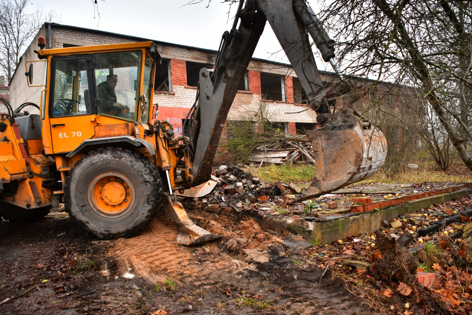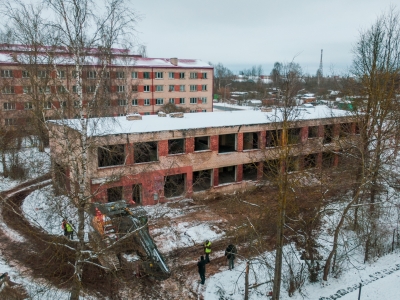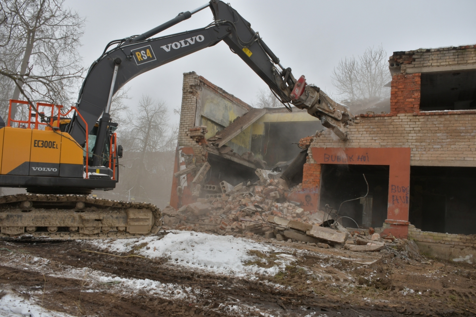 Ēkas teritorijā tika vākti atkritumi, veikti vienkārši brucināšanas darbi. Ēkas demontāža ar smagās tehnikas palīdzību tika uzsākta 23. novembrī un turpināsies tuvākās dienas. Pēc tam būvgruži tiks smalcināti.