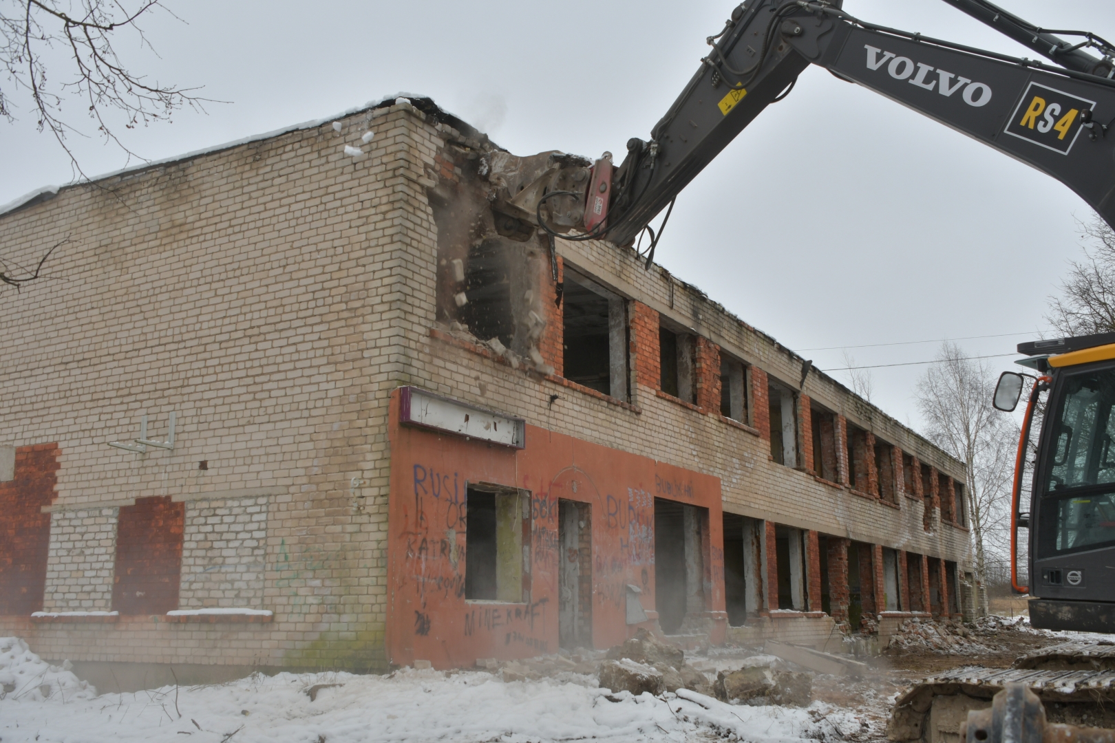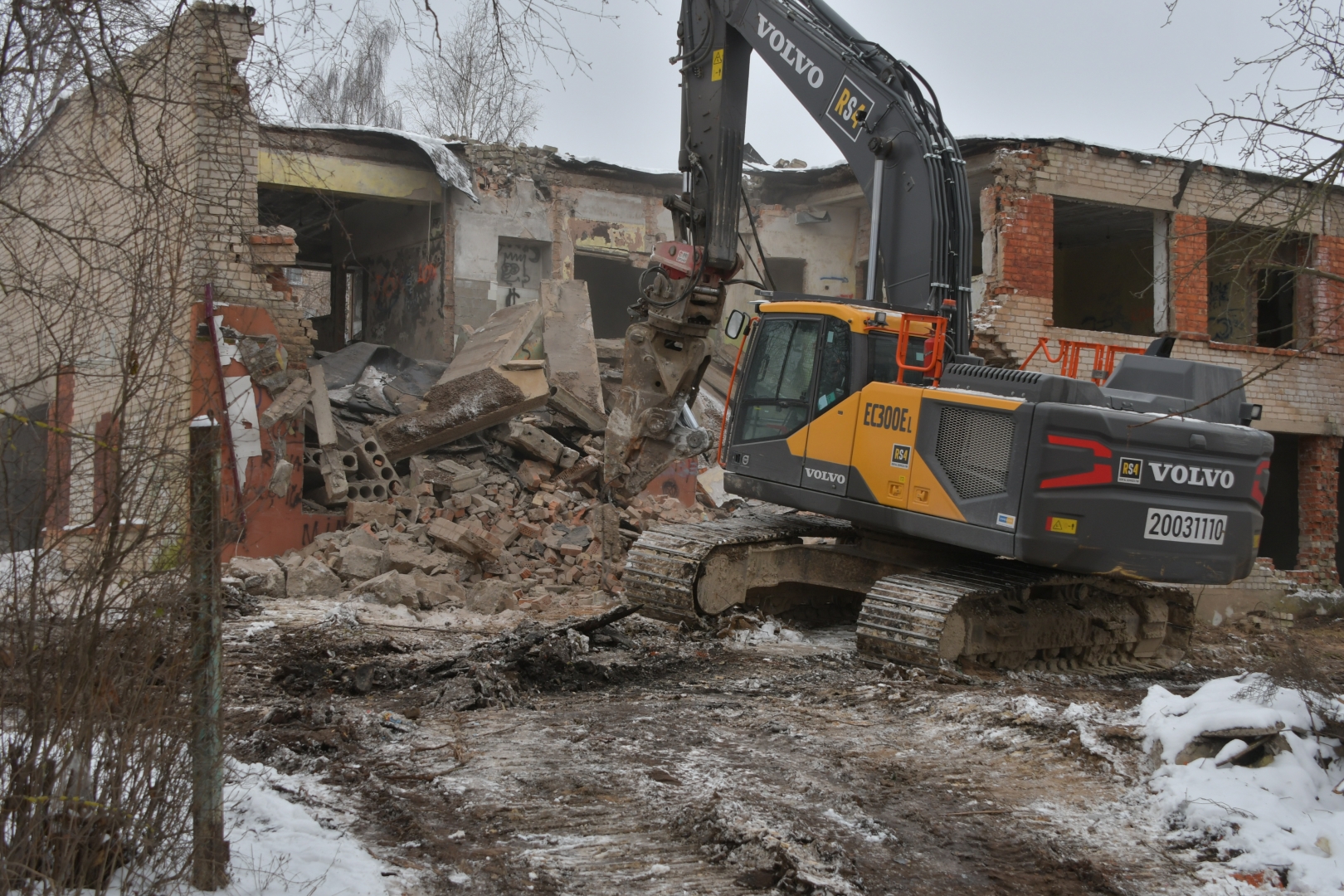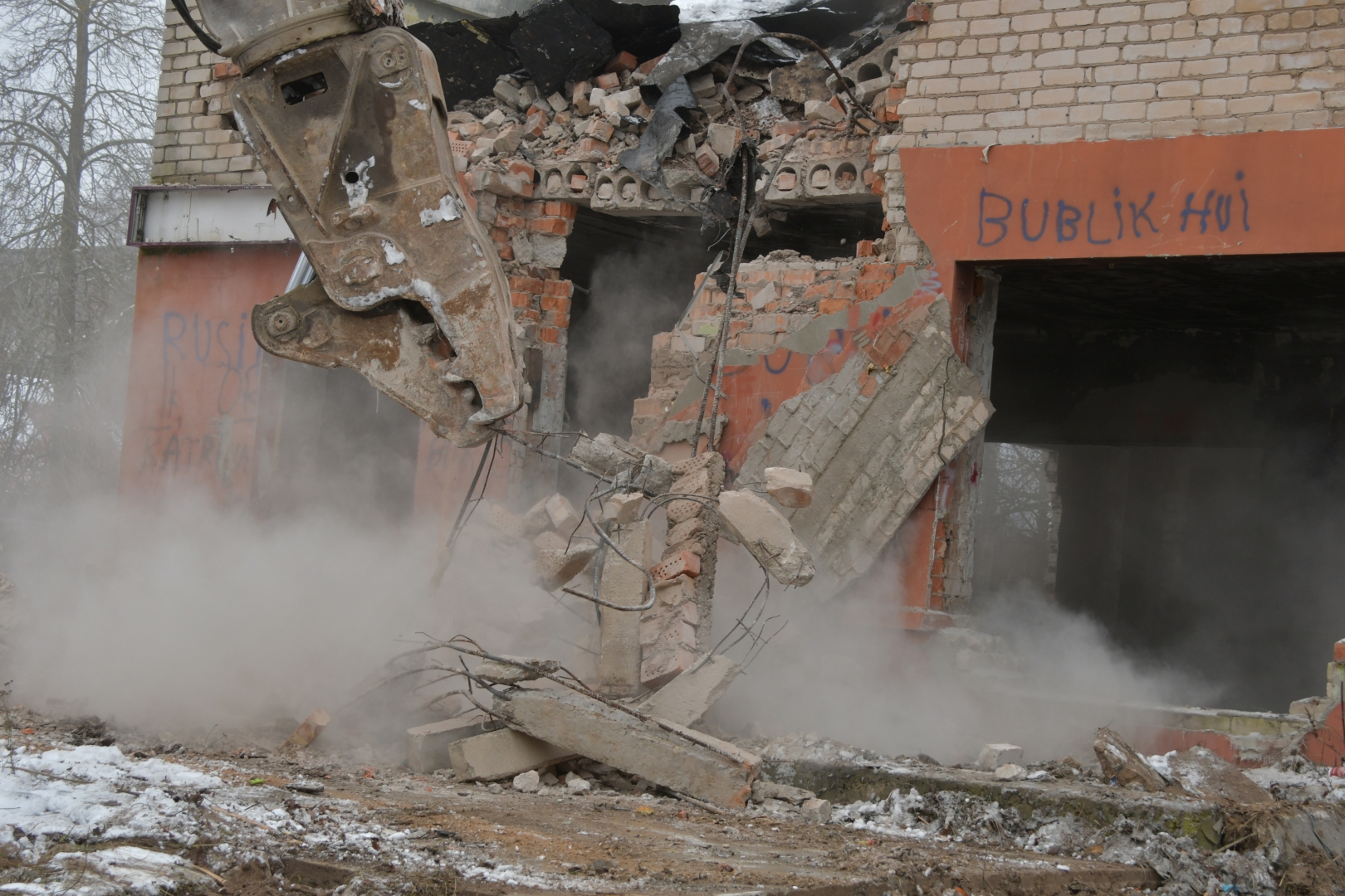 Ēkas teritorijā tika vākti atkritumi, veikti vienkārši brucināšanas darbi. Ēkas demontāža ar smagās tehnikas palīdzību tika uzsākta 23. novembrī un turpināsies tuvākās dienas. Pēc tam būvgruži tiks smalcināti.