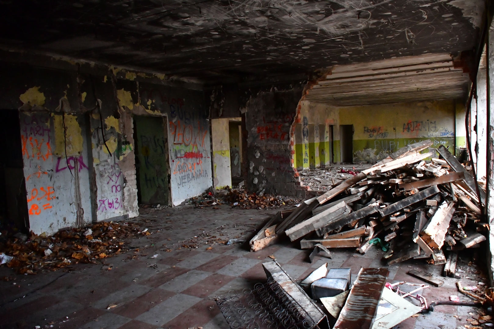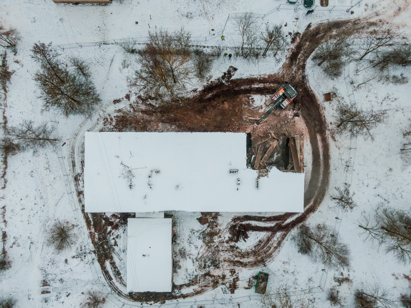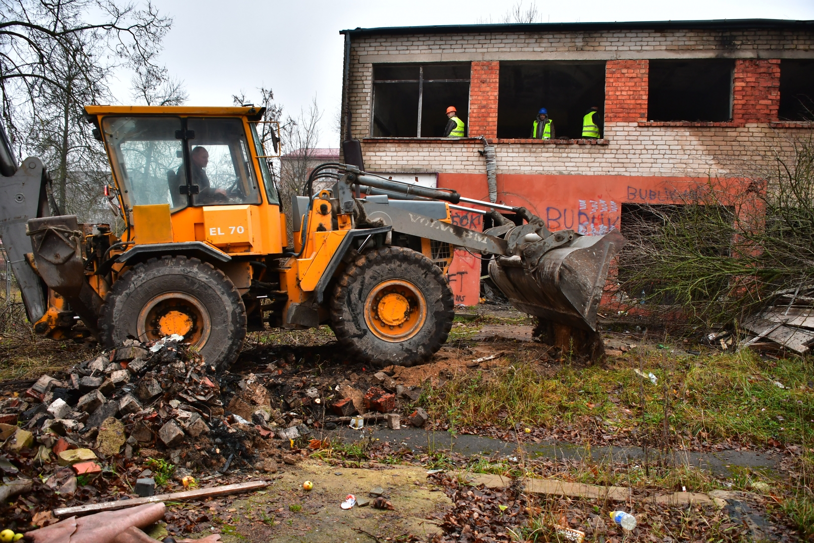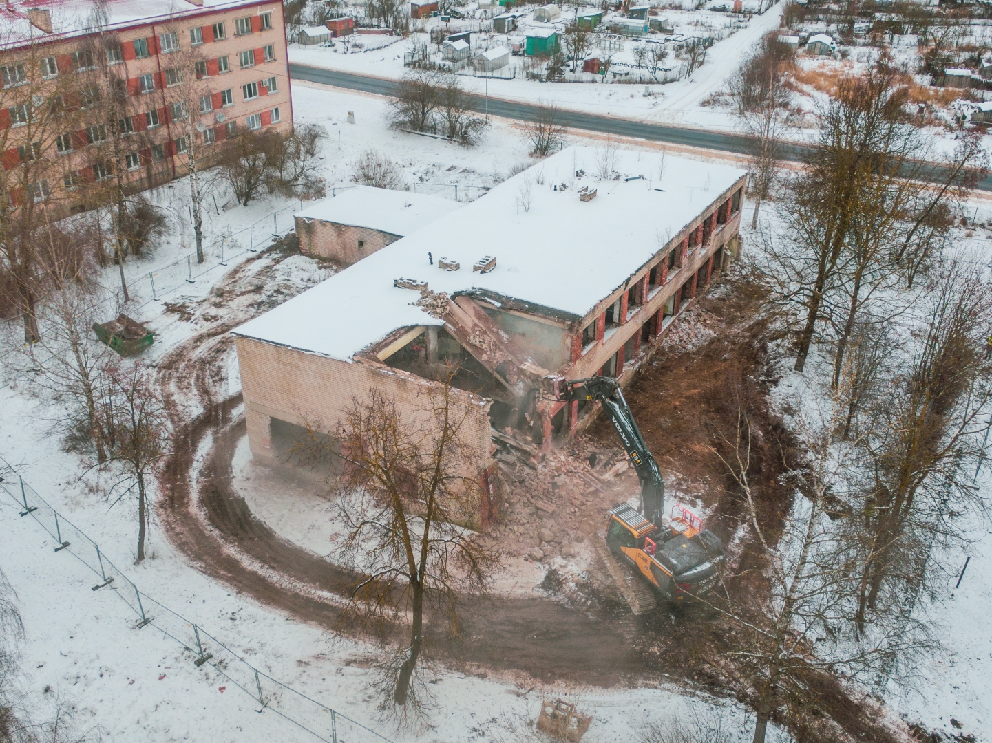 Ēkas teritorijā tika vākti atkritumi, veikti vienkārši brucināšanas darbi. Ēkas demontāža ar smagās tehnikas palīdzību tika uzsākta 23. novembrī un turpināsies tuvākās dienas. Pēc tam būvgruži tiks smalcināti.