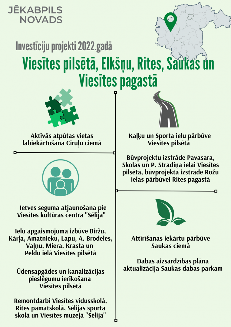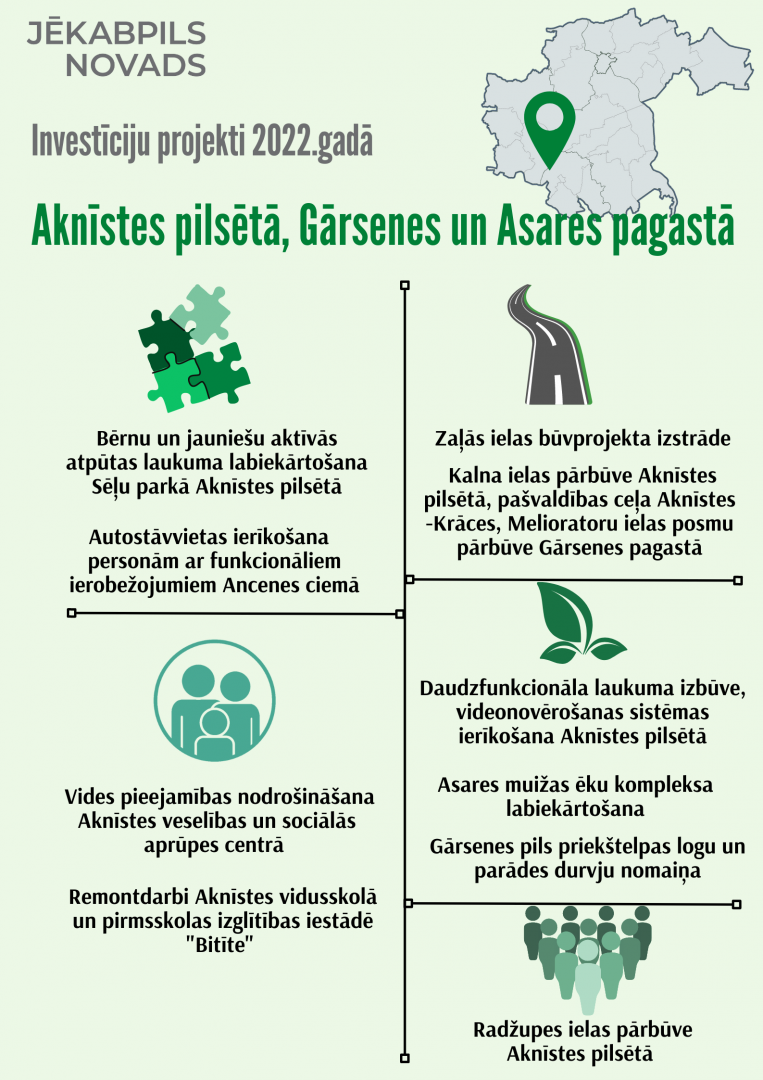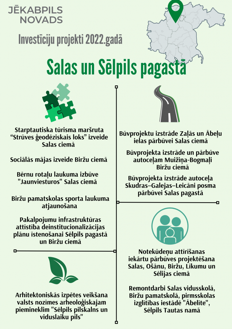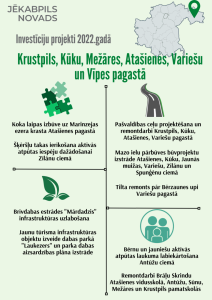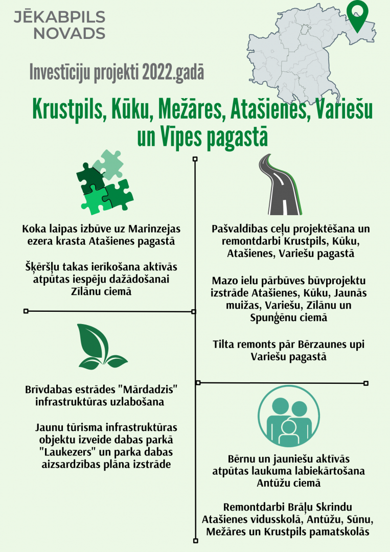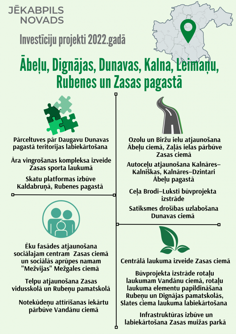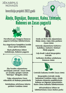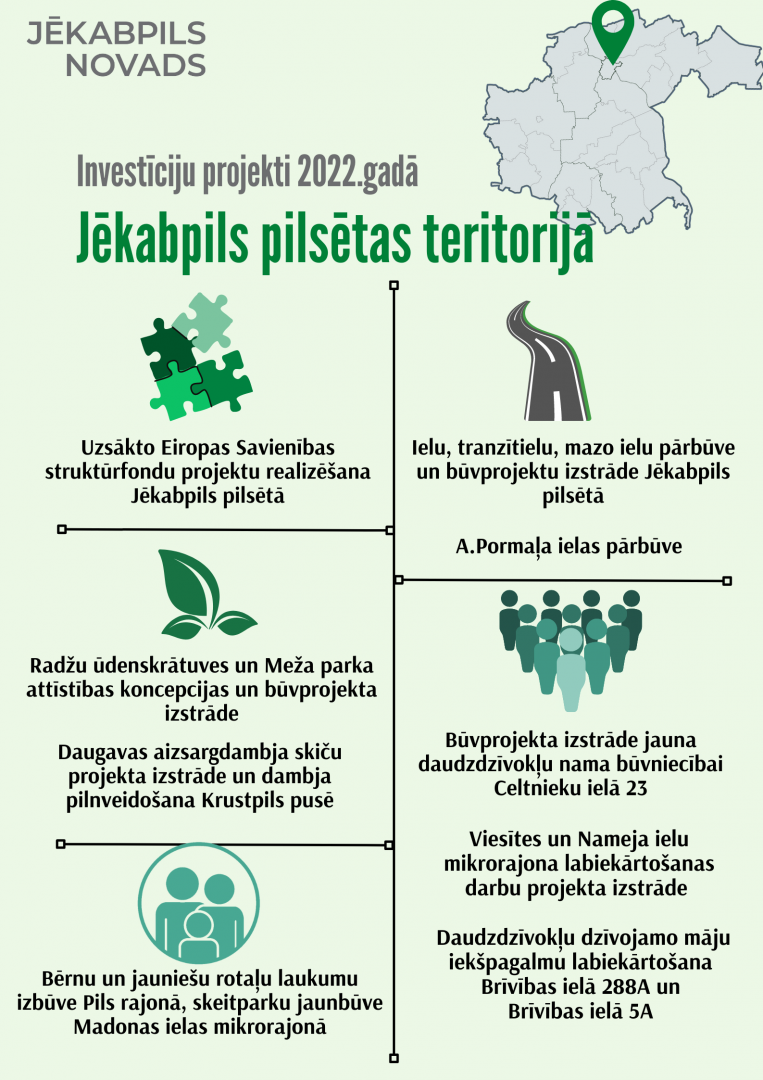 Saistībā ar Jēkabpils novada pašvaldībā pieņemto 2022.gada budžetu, iepazīstinām ar plānotajiem investīciju projektiem Jēkabpils novada pilsētās, pagastos un ciemos.