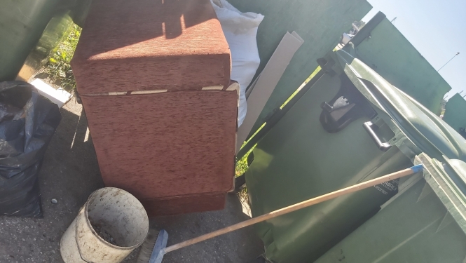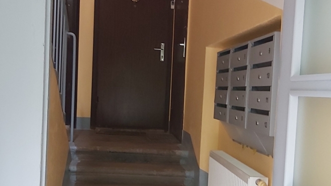 Pelēka daudzdzīvokļi māja ar tumši sarkaniem balkoniem