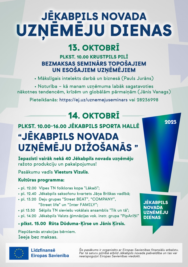 13. oktobrī notiks arī konkursa “Jēkabpils novada Gada balva uzņēmējdarbībā 2023” laureātu godināšana (pasākums ar ielūgumiem).