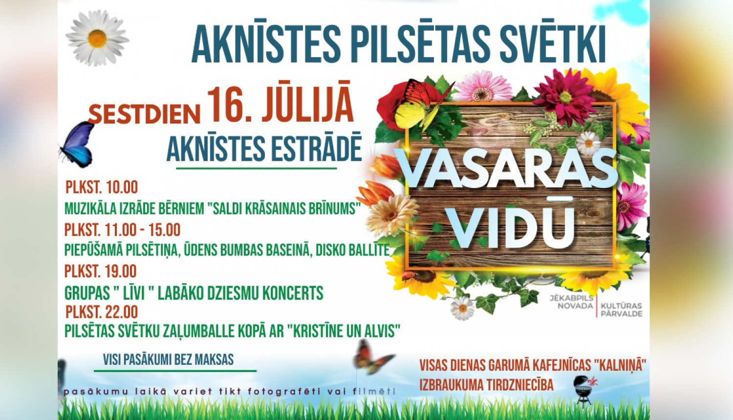 16. jūlijā Aknīstes estrādē tiks svinēti Aknīstes pilsētas svētki ar moto “Vasaras vidū”.