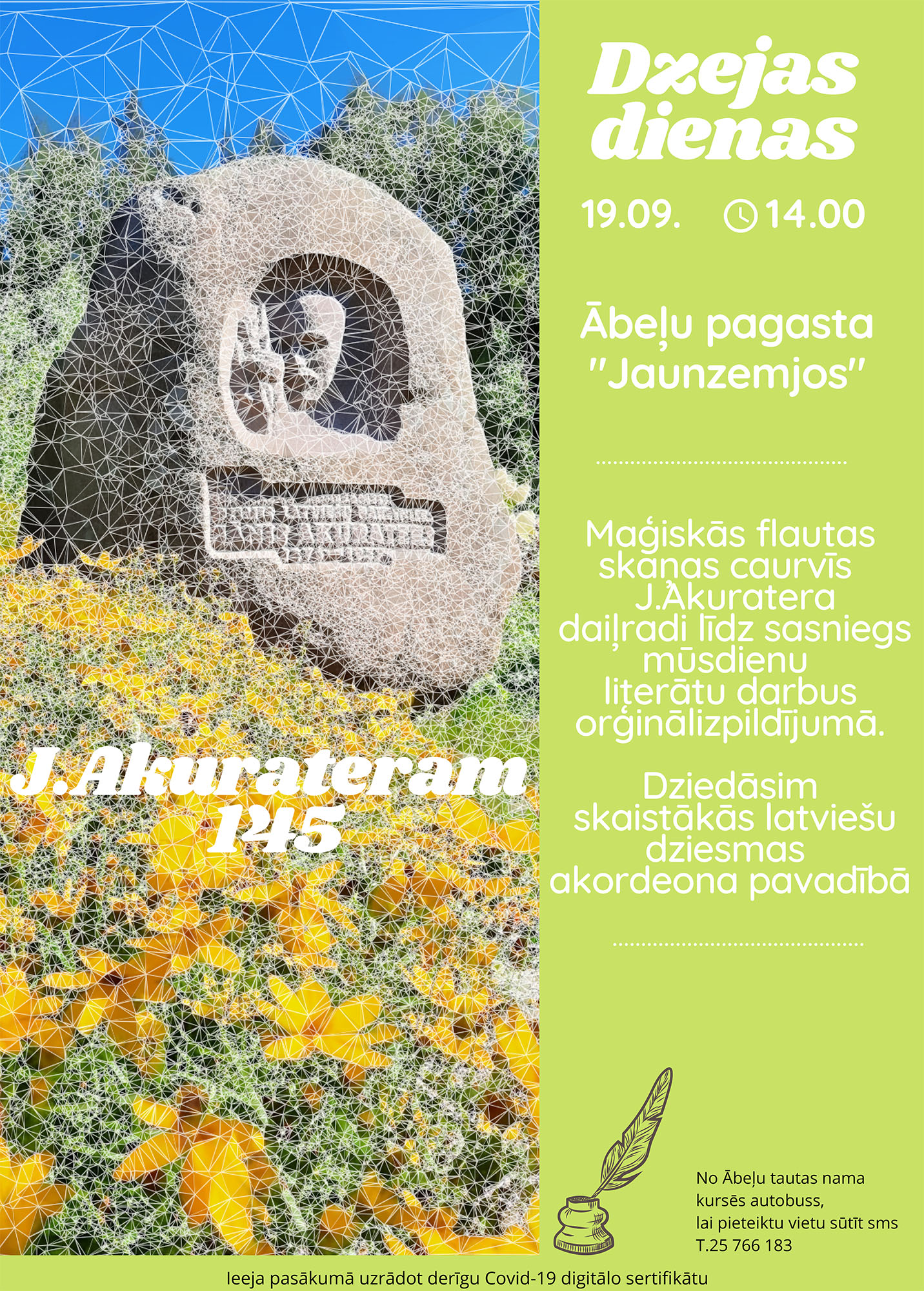 19. septembrī plkst. 14.00 Dzejas dienas Ābeļu pagasta "Jaunzemjos" – Jānim Akurateram 145. Maģiskās flautas skaņas caurvīs J.Akuratera daiļradi, līdz sasniegs mūsdienu literātu darbus oriģinālizpildījumā. Dziedāsim skaistākās latviešu dziesmas akordeona pavadībā.