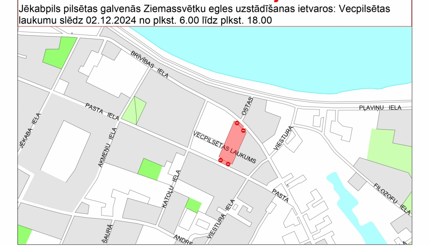 Ņemot vērā Jēkabpils pilsētas galvenās Ziemassvētku egles uzstādīšanu, 2. decembrī no plkst. 6:00 līdz 18:00 Vecpilsētas laukums būs slēgts.
