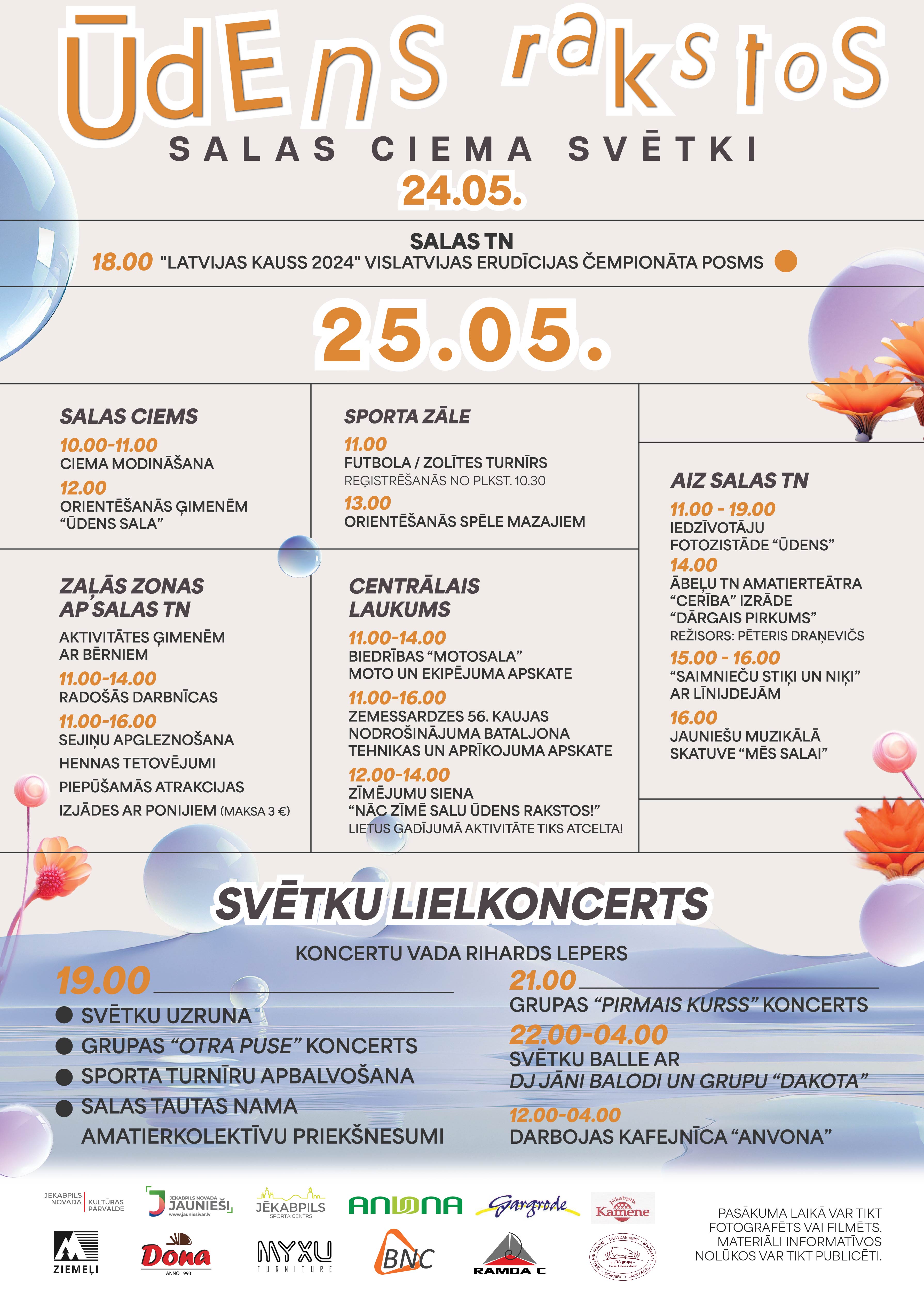 Sestdien, 25. maijā, no plkst. 12.00 ģimenes tiek aicinātas piedalīties orientēšanās sacensībās, lai atrastu un iepazītu dažādus ūdens objektus Salas ciema teritorijā. Mazie svētku apmeklētāji varēs izmēģināt savas prasmes radošajās darbnīcās, vizināties ar poniju un izlēkāties piepūšamās atrakcijās. Būs ieradies pat lielais Pirātu kuģis.