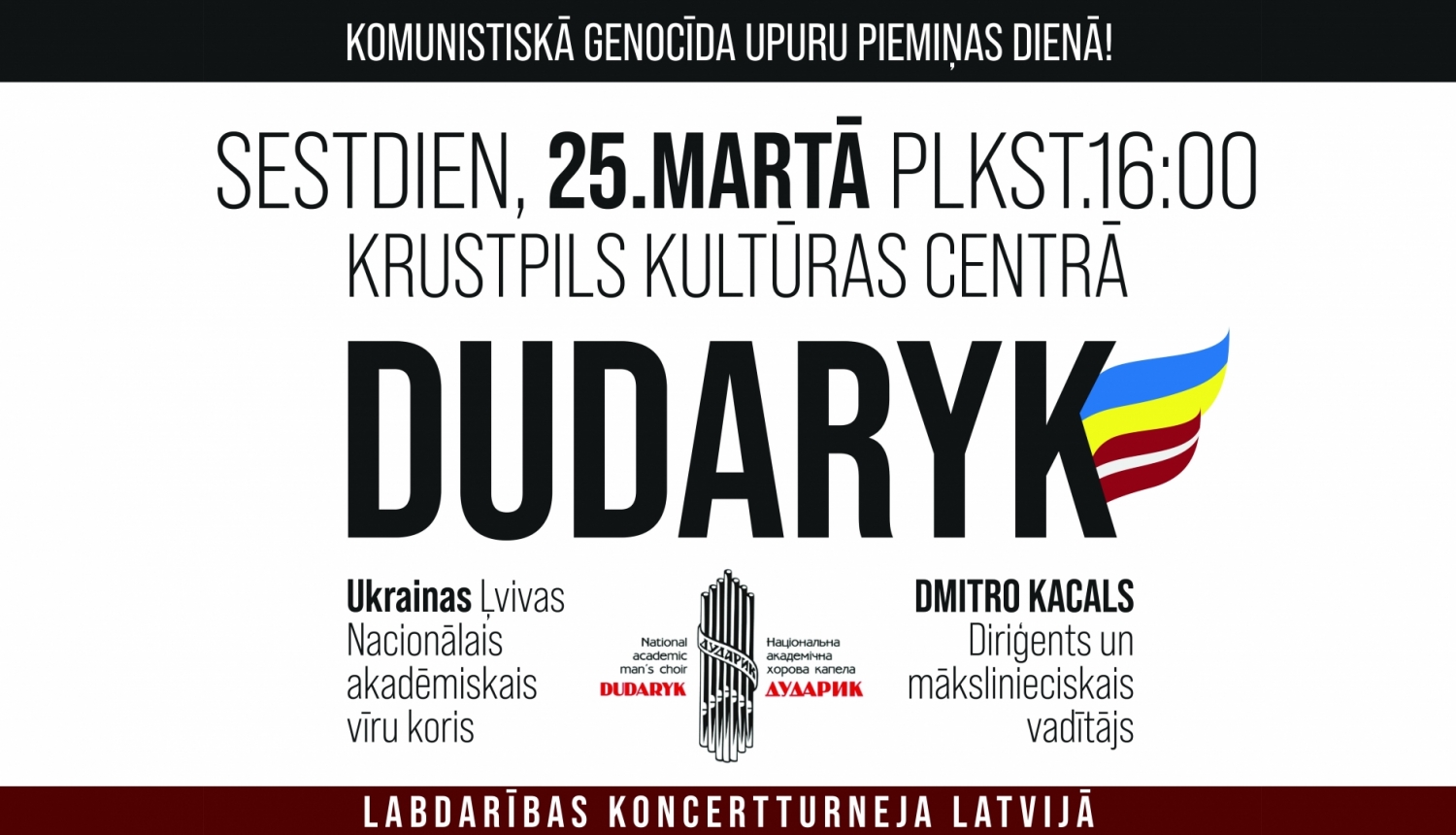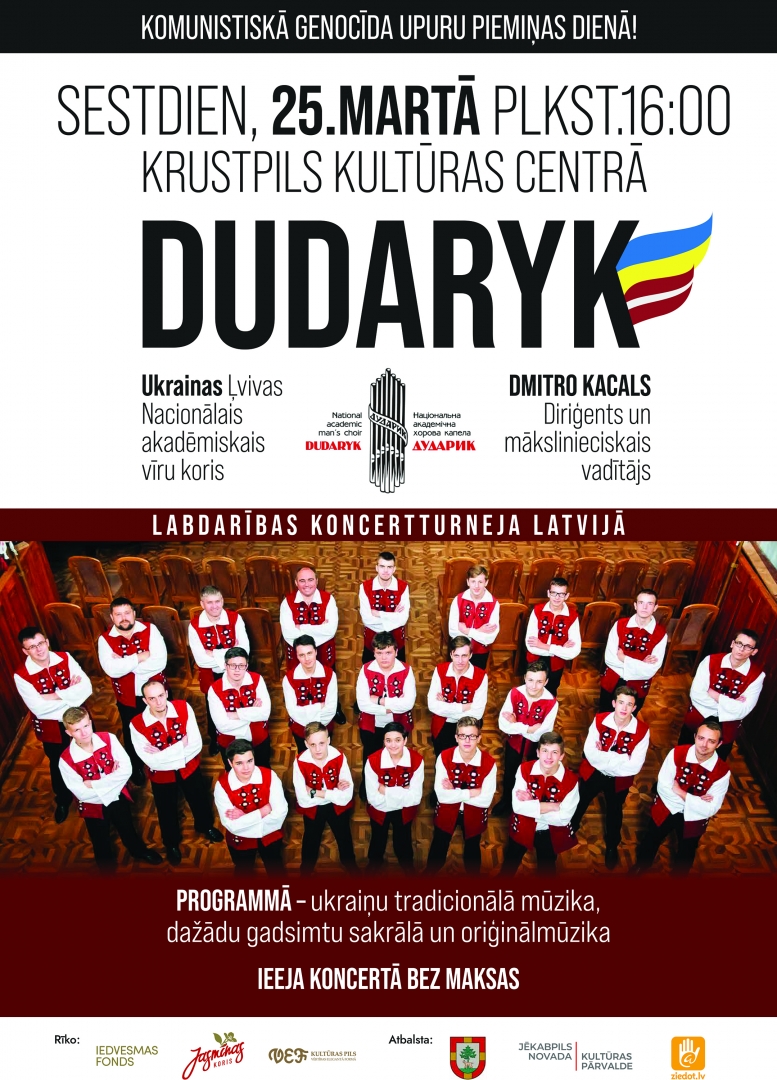25.martā plkst. 16.00 Krustpils kultūras centrā notiks Ļvivas Akadēmiskā Nacionālā vīru un zēnu kora “DUDARYK” labdarības koncerts.