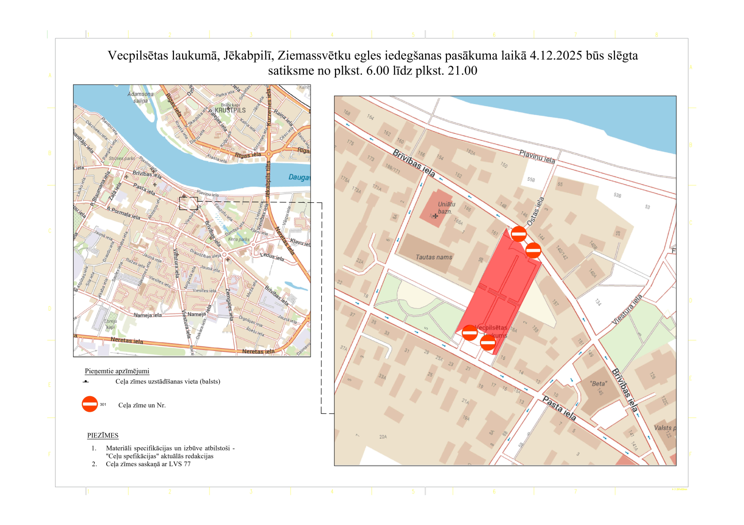 Jēkabpilī, Vecpilsētas laukumā, 4.12.2025. būs slēgta satiksme no plkst. 6.00 līdz plkst. 21.00, sakarā ar Ziemassvētku egles rotāšanu un iedegšanas pasākumu.