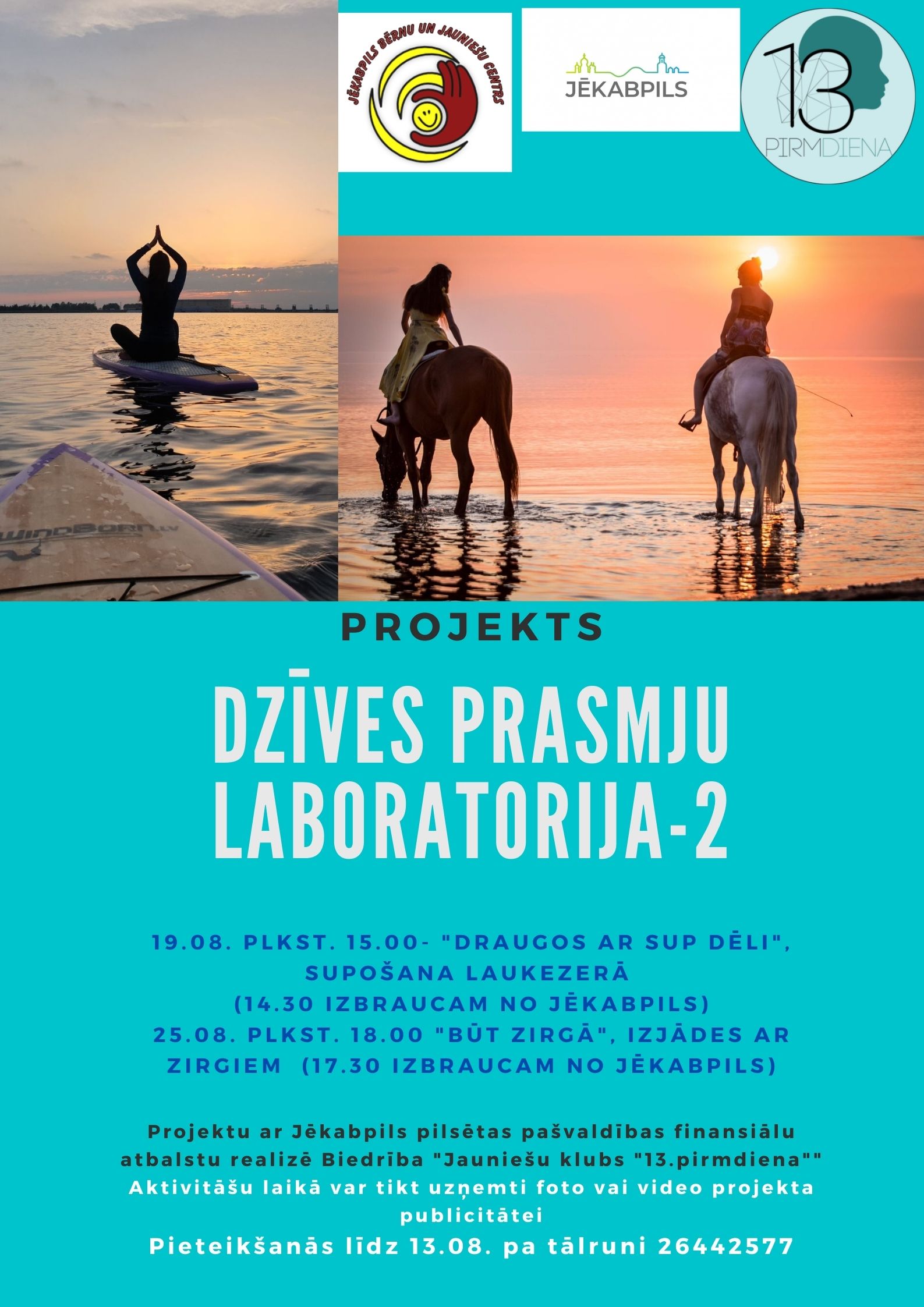 Augusta mēnesī biedrība “Jauniešu klubs “13. pirmdiena”” projekta “Dzīves prasmju laboratorija-2” ietvaros aicina jauniešus pieteikties supošanai Laukezerā 19.08. plkst.15.00 un izjādei ar zirgiem 25.08. plkst.18.00 zirgu staļļos “Ūsiņš”. Aktivitātes finansiāli atbalsta Jēkabpils pilsētas pašvaldība un Jēkabpils Bērnu un jauniešu centrs, bet realizē jauniešu klubs “13. pirmdiena”.
