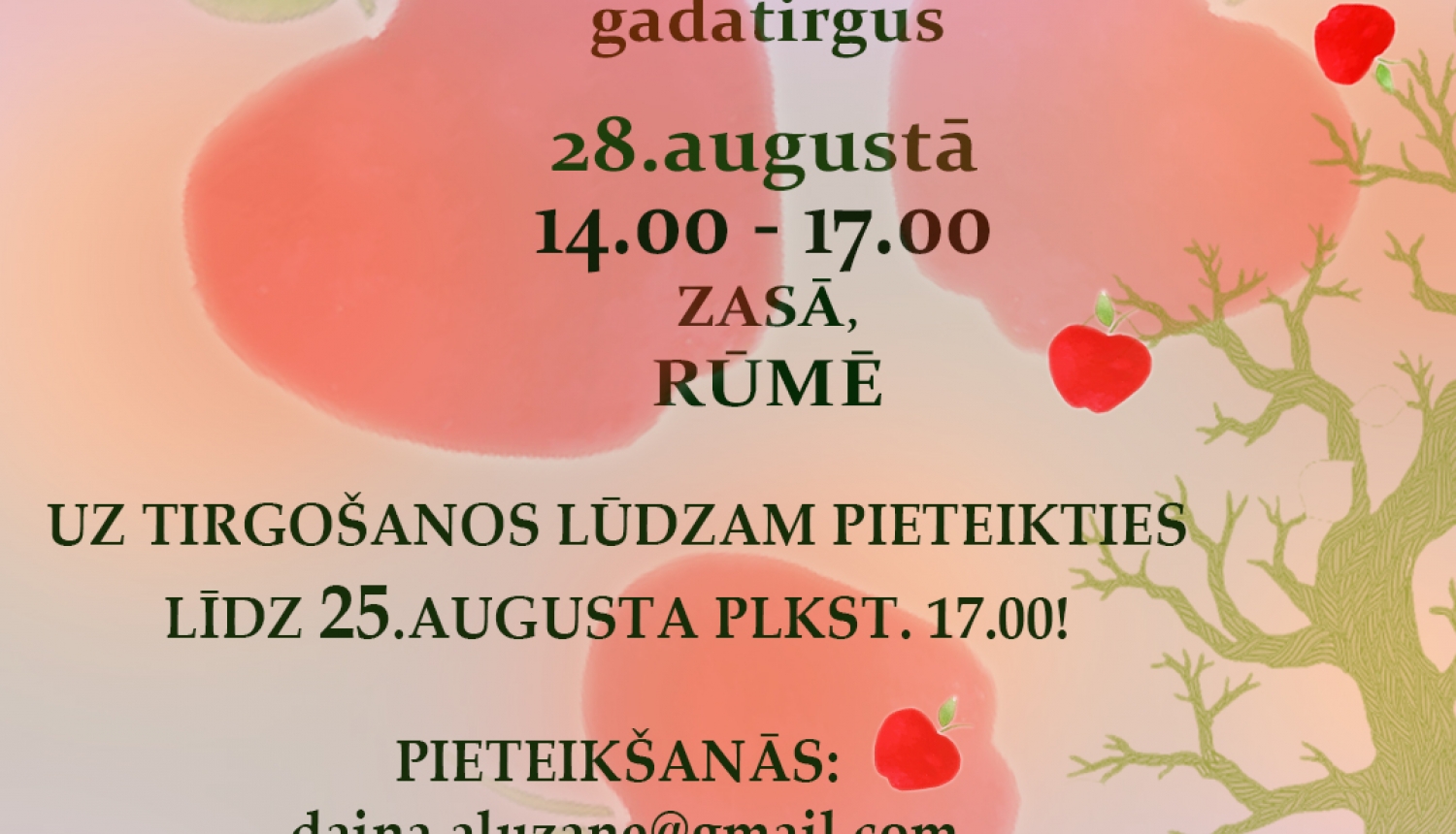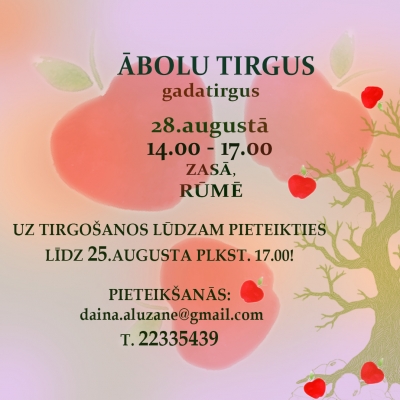 Līdz 25. augusta vakaram Jēkabpils novada amatniecības centrs "Rūme" aicina pieteikties dārzeņu, augļu, ogu audzētājus, mājražotājus, amatniekus, meža velšu lasītājus - visus, kam vien ir vēlēšanās tirgoties gadatirgū 28. augustā, Zasā, amatniecības centrā "Rūme"!