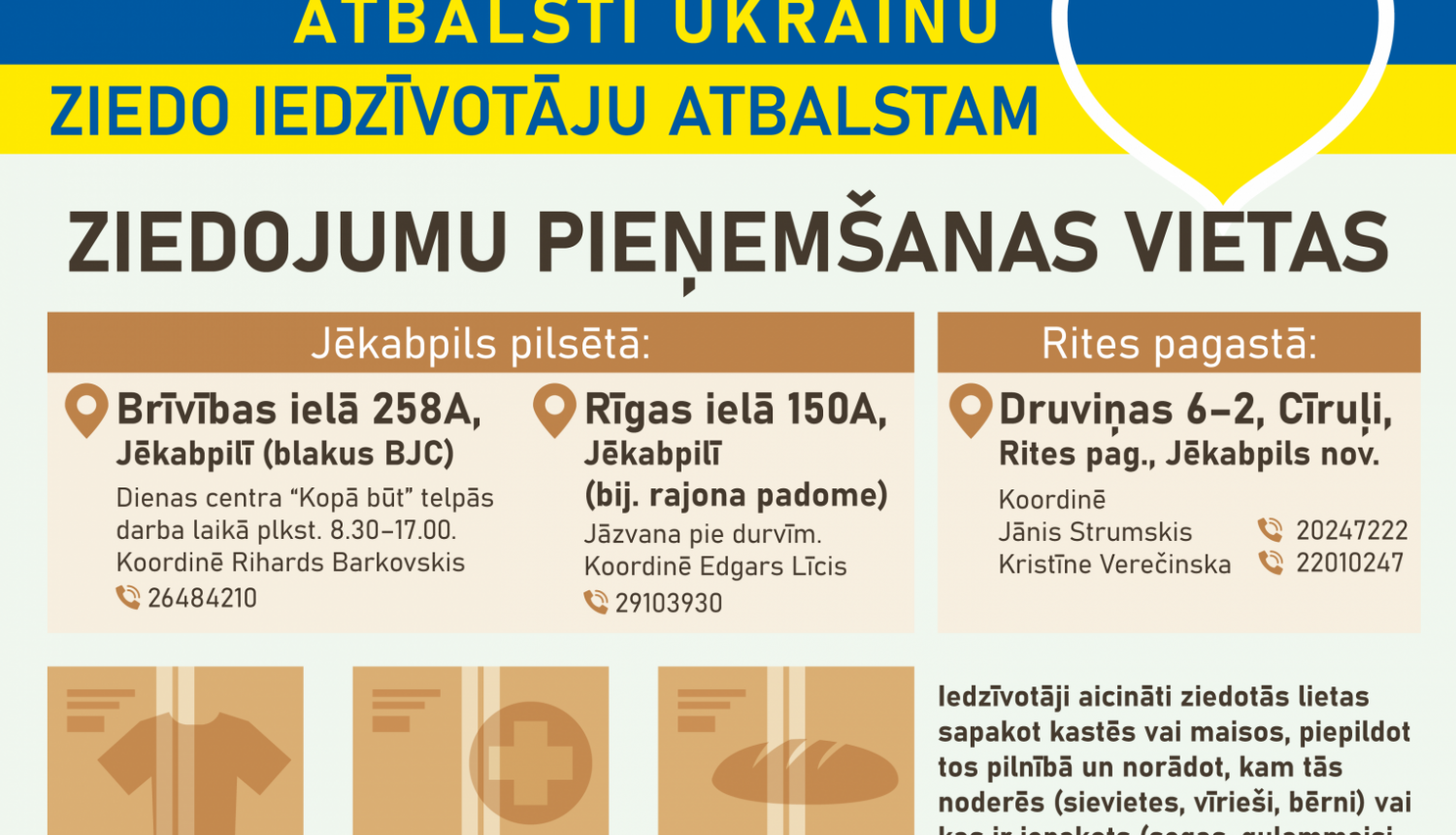 Visu, ko variet ziedot, lūdzam nogādāt Rīgas ielā 150a, Jēkabpilī, Jēkabpils novadā katru darba dienu no plkst.8:00 līdz 17:00 (var arī pēc darba laika, zvanot pie galvenajām durvīm) -> šajā vietā ziedotās lietas lielākoties dosies uz Ukrainu.