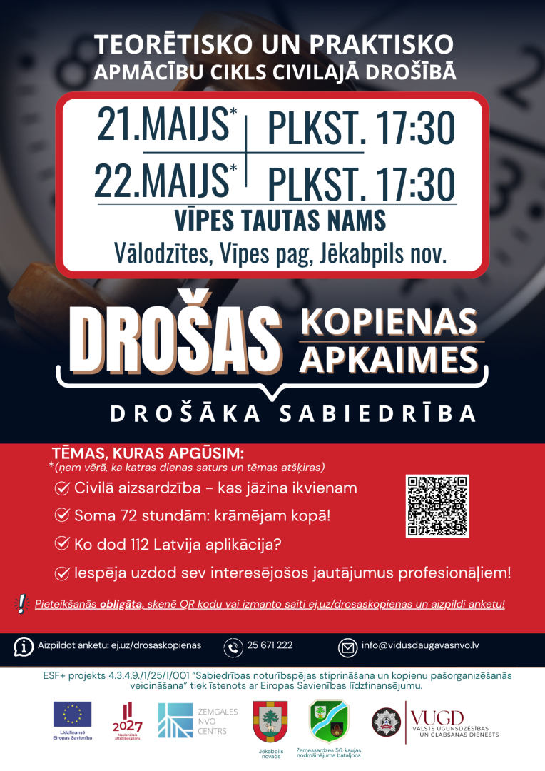 Aicinām iedzīvotājus piedalīties teorētisko un praktisko apmācību ciklā civilajā drošībā “Drošas kopienas – drošāka sabiedrība”, kas maijā norisināsies Jēkabpils novadā.
