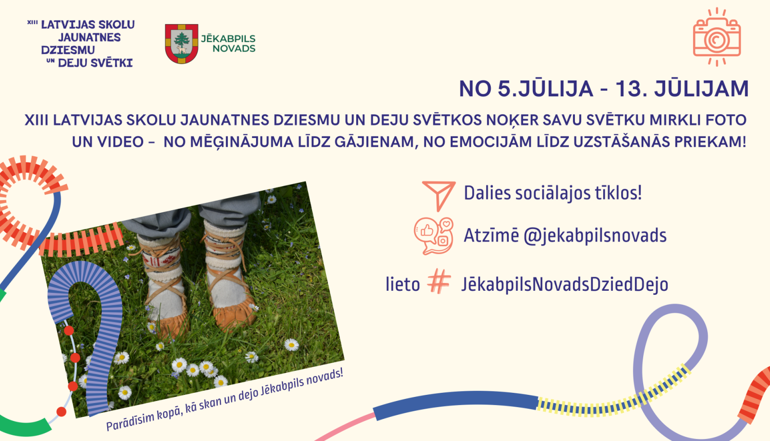 Skolēnu dziesmu un deju svētkos aicinām Jēkabpils novada dziedātājus, dejotājus, folkloras kopu dalībniekus, pūtēju orķestra dalībniekus, māksliniekus un svētku apmeklētājus no 5. līdz 13. jūlijam iemūžināt savus svētku mirkļus – no mēģinājumiem un aizkulisēm līdz gājienam, no pirmā uznāciena līdz ovācijām!