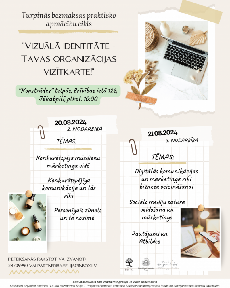 Biedrība “Lauku partnerība Sēlija” sadarbībā ar Jēkabpils novada pašvaldību, projekta “Vienoti abos Daugavas krastos” (identifikācijas Nr. 2024.LV/NVOF/MIC/016) ietvaros, turpina praktisko apmācību ciklu “Vizuālā identitāte - Tavas organizācijas vizītkarte!”.