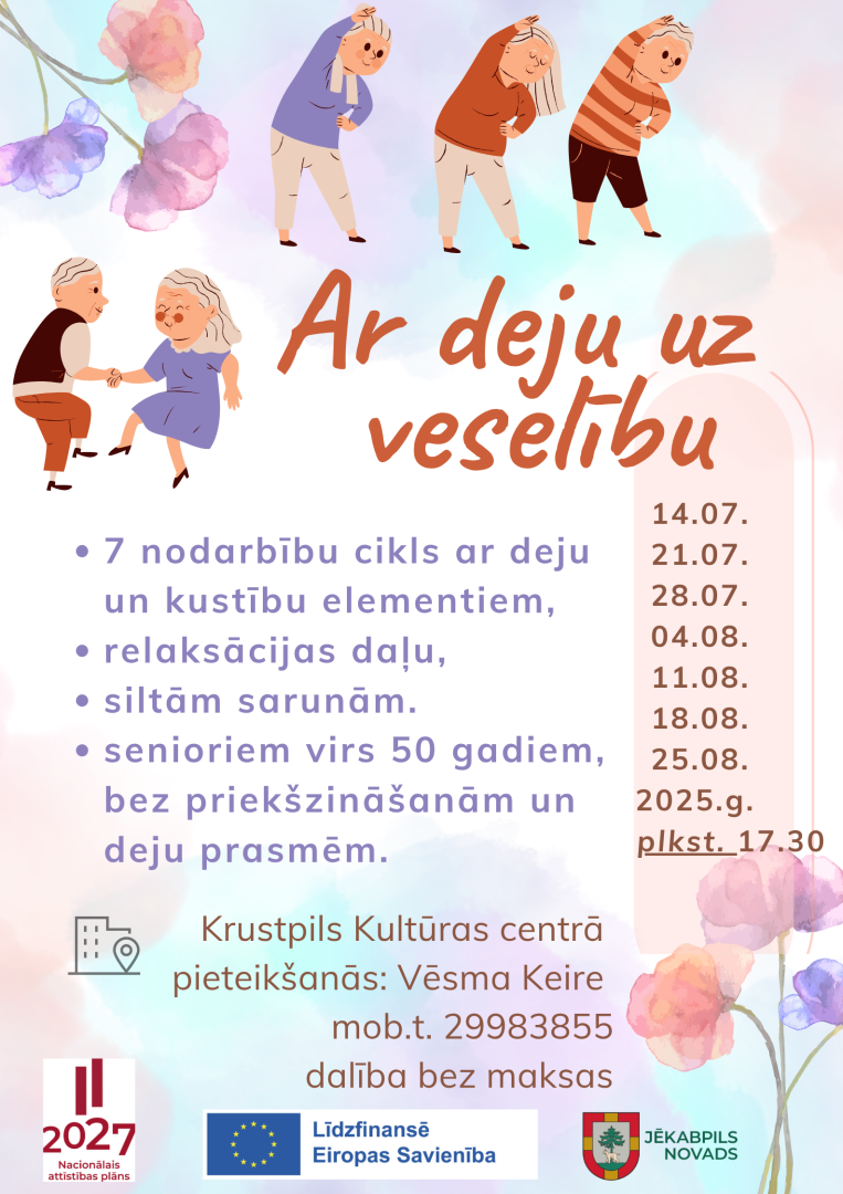 Deju nodarbības “Ar deju uz veselību” no 14. jūlija līdz 25. augustam tiks organizētas pirmdienās plkst. 17.30 Krustpils kultūras centrā (Rīgas ielā 212). Nav nepieciešamas iepriekšējas zināšanas vai prasmes – aicināts ikviens!