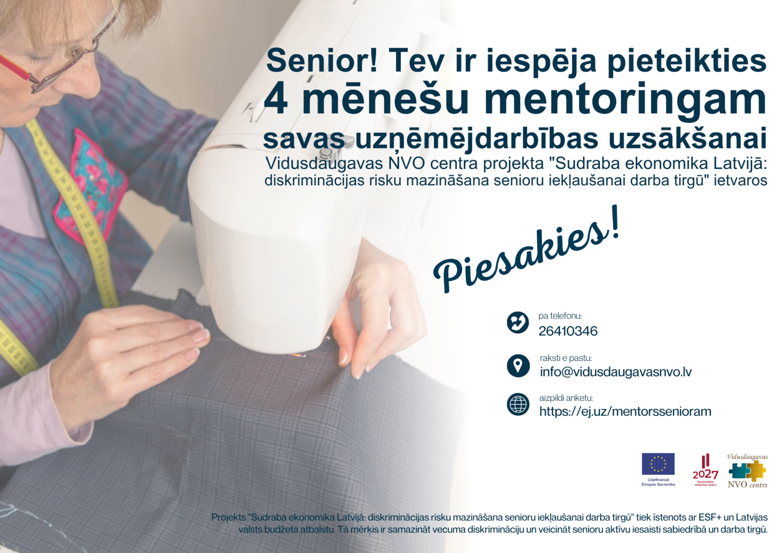 Vidusdaugavas NVO centrs aicina seniorus (55+) pieteikties dalībai 4 mēnešu mentoringa programmā, kas sniedz iespēju uzsākt vai attīstīt savu uzņēmējdarbību!