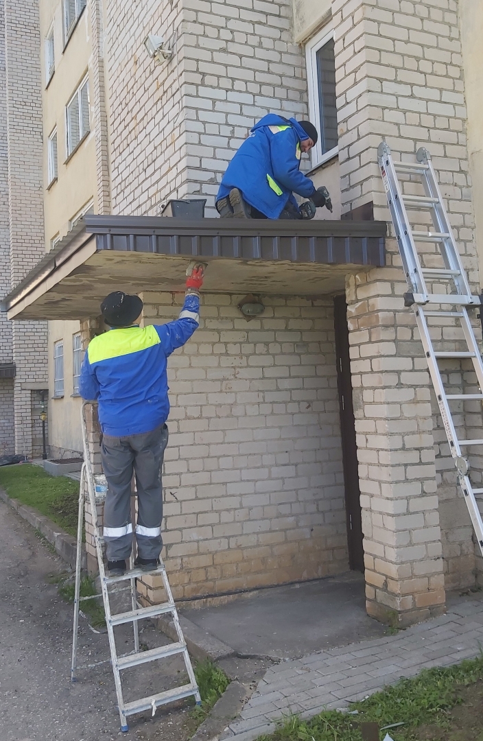 Tiek remontēti ieeju jumtiņi mājā Krasta ielā 61.