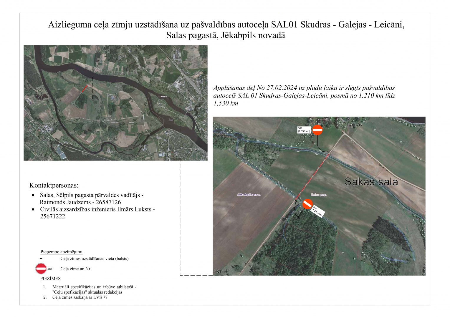 Sakas salā applūdis un uz laiku satiksmei slēgts pašvaldības autoceļš Skudras-Galejas-Leicāni posmā no 1,210 km līdz 1,530 km.