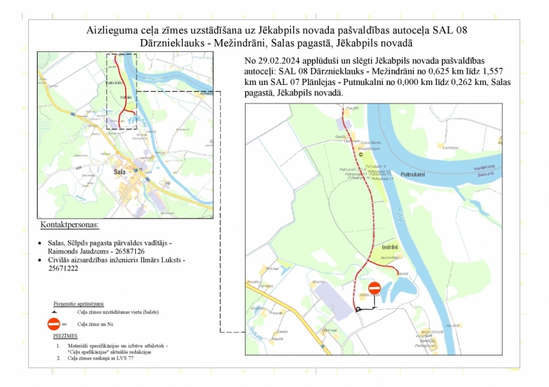 No 29.02.2024 applūduši un slēgti Jēkabpils novada pašvaldības autoceļi: SAL 08 Dārznieklauks - Mežindrāni no 0,625 km līdz 1,557 km un SAL 07 Plānlejas - Putnukalni no 0,000 km līdz 0,262 km, Salas pagastā, Jēkabpils novadā.