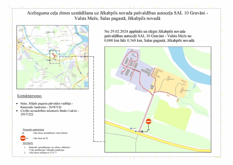 No 29.02.2024 applūdis un slēgts Jēkabpils novada pašvaldības autoceļš SAL 10 Gravāni - Valsts Mežs no 0,000 km līdz 0,360 km, Salas pagastā, Jēkabpils novadā.