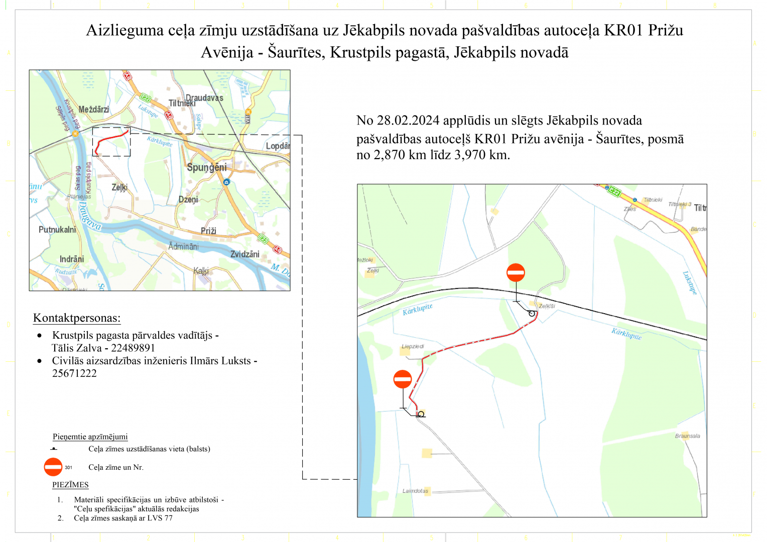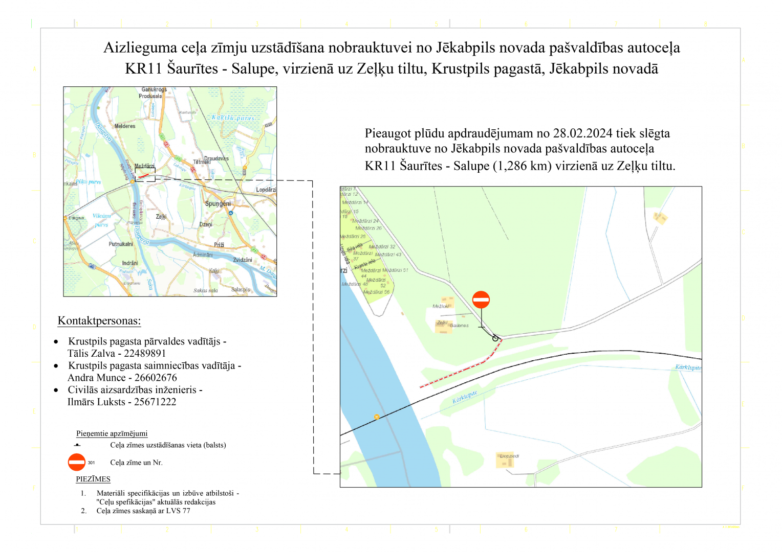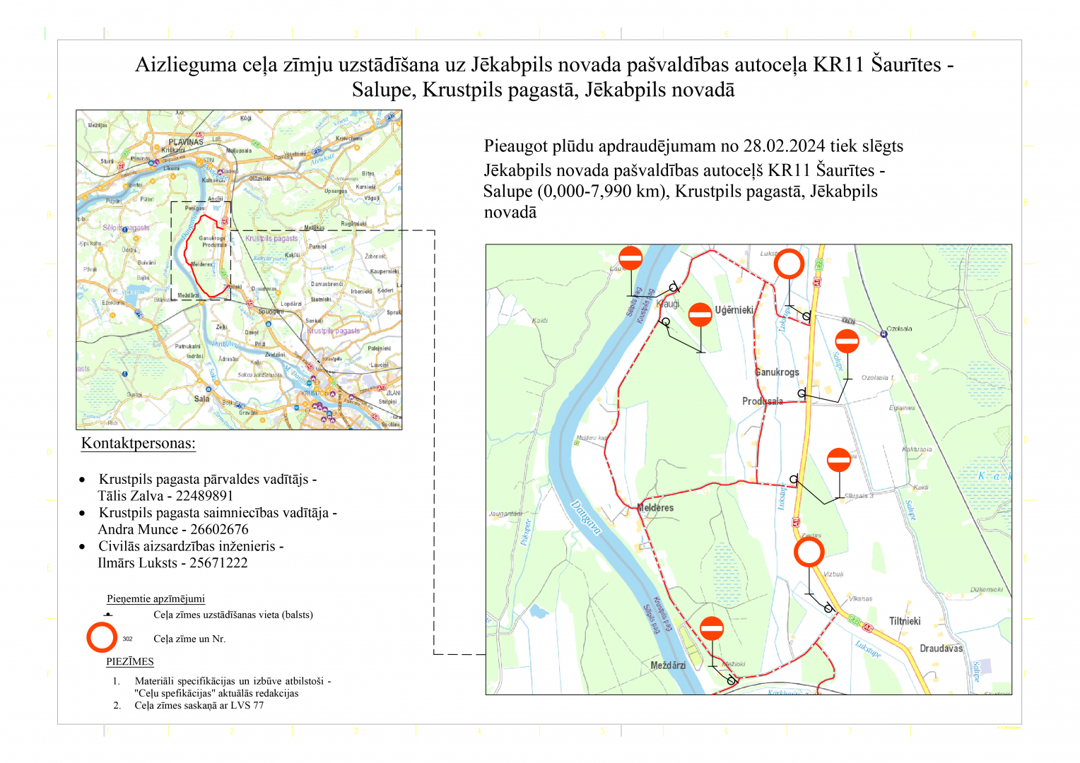 No 28.02.2024 applūduši un slēgti ceļi Krustpils pagastā: