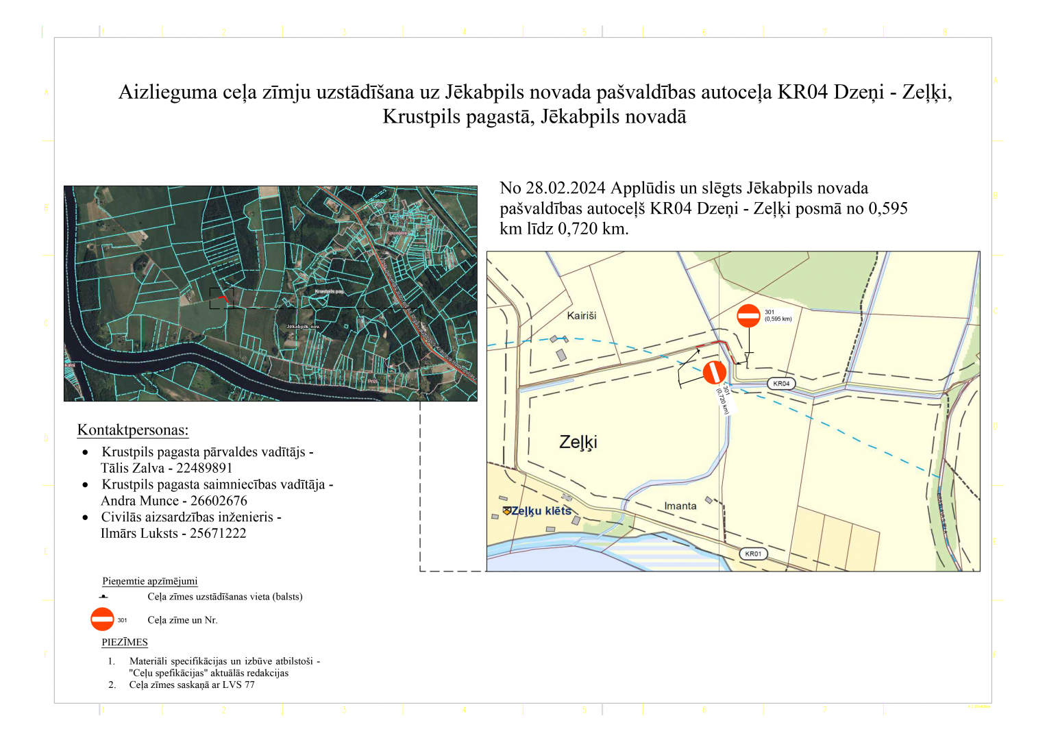 - Jēkabpils novada pašvaldības autoceļš KR04 Dzeņi-Zeļķi posmā no 0,595 km līdz 0,720 km;