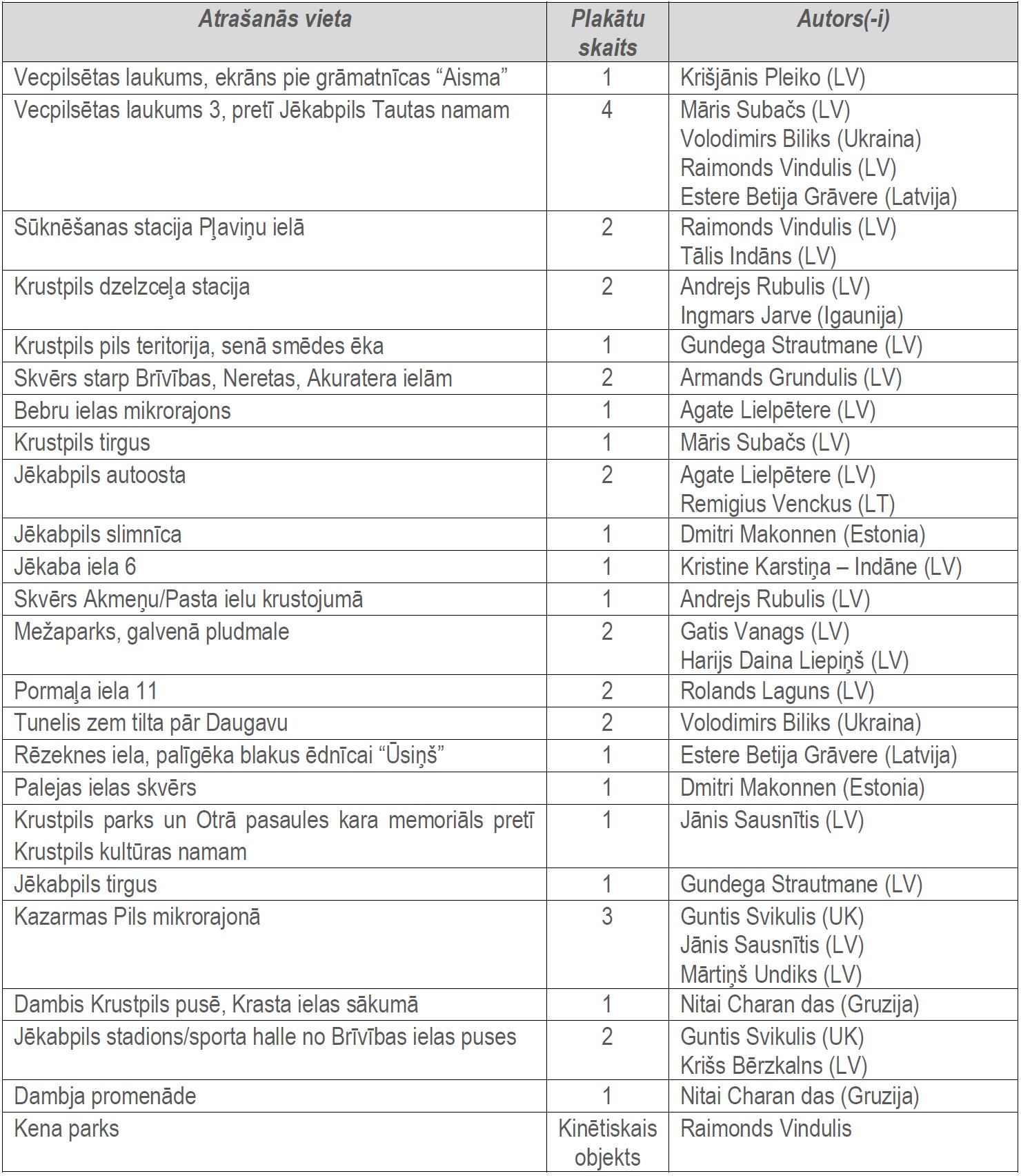 Plakāti izvietoti 24 dažādās Jēkabpils vietās – gan centrālajos laukumos un parkos, gan dzīvojamo māju mikrorajonos, gan pilsētas nomalēs. Ar vietu sarakstu iespējams iepazīties www.jekabpils.lv, izstādes sociālo tīklu profilos, tāpat izstādes maršruta apraksts ikvienam interesentam pieejams Jēkabpils Tūrisma informācijas centrā.