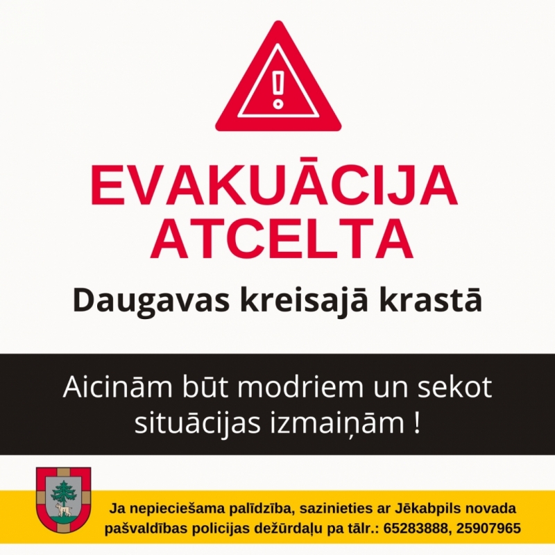Sakarā ar plūdu apdraudējuma mazināšanos, no šodienas, 17. janvāra, plkst. 18.00 tiek atcelta evakuācija Daugavas kreisajā krastā. Aicinām iedzīvotājus būt modriem un sekot līdzi informācijai, jo var būt iespējama atkārtota evakuācija!