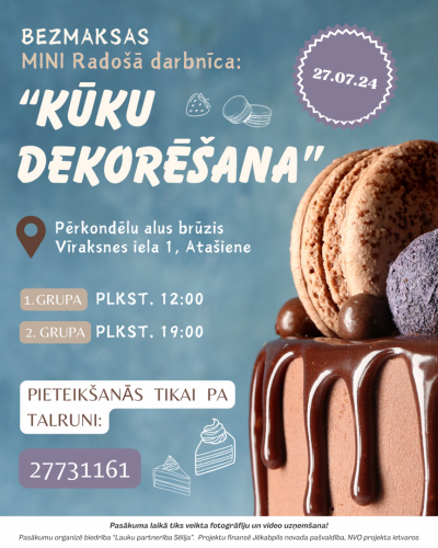 Dalībnieki ir aicināti pieteikties dalībai projekta “Bez kūkām vairs nevar” aktivitātē - mini radoša darbnīca “Kūku dekorēšana”, 27. jūlijā, plkst. 16:00, Pērkondēlu Alus brūzī, Vīraksnes ielā 1, Atašienē!