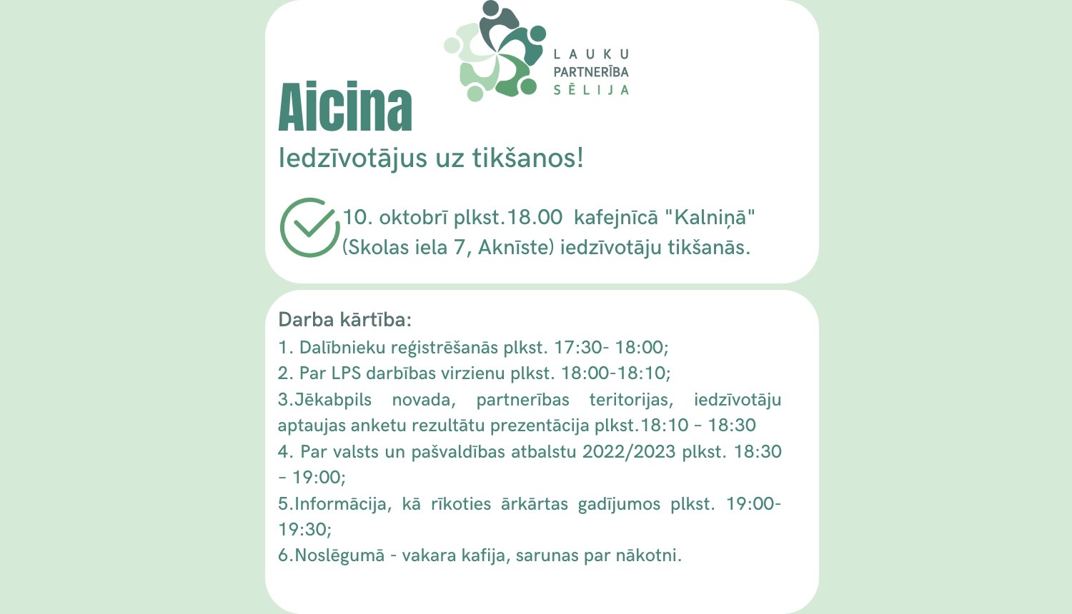 - 10. oktobrī plkst.18.00 kafejnīcā “Kalniņā” (Skolas iela 7, Aknīstē, Jēkabpils nov.) iedzīvotāju tikšanās.