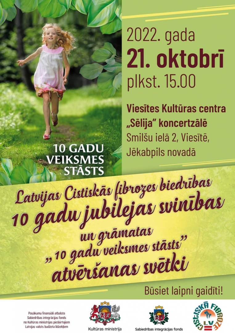 Grāmatas “10 gadu veiksmes stāsts” atvēršanas svētki un biedrības 10 gadu jubilejas svinības notiks piektdien, 21. oktobrī plkst. 15.00 Viesītes Kultūras centra “Sēlija” koncertzālē (Smilšu ielā 2, Viesītē, Jēkabpils novadā). Svinīgajā pasākumā biedrība iepazīstinās ar savu grāmatu gan drukātā, gan digitālā formātā, kas pēc 21. oktobra būs pieejama biedrības mājas lapā https://cistiskafibroze.lv/