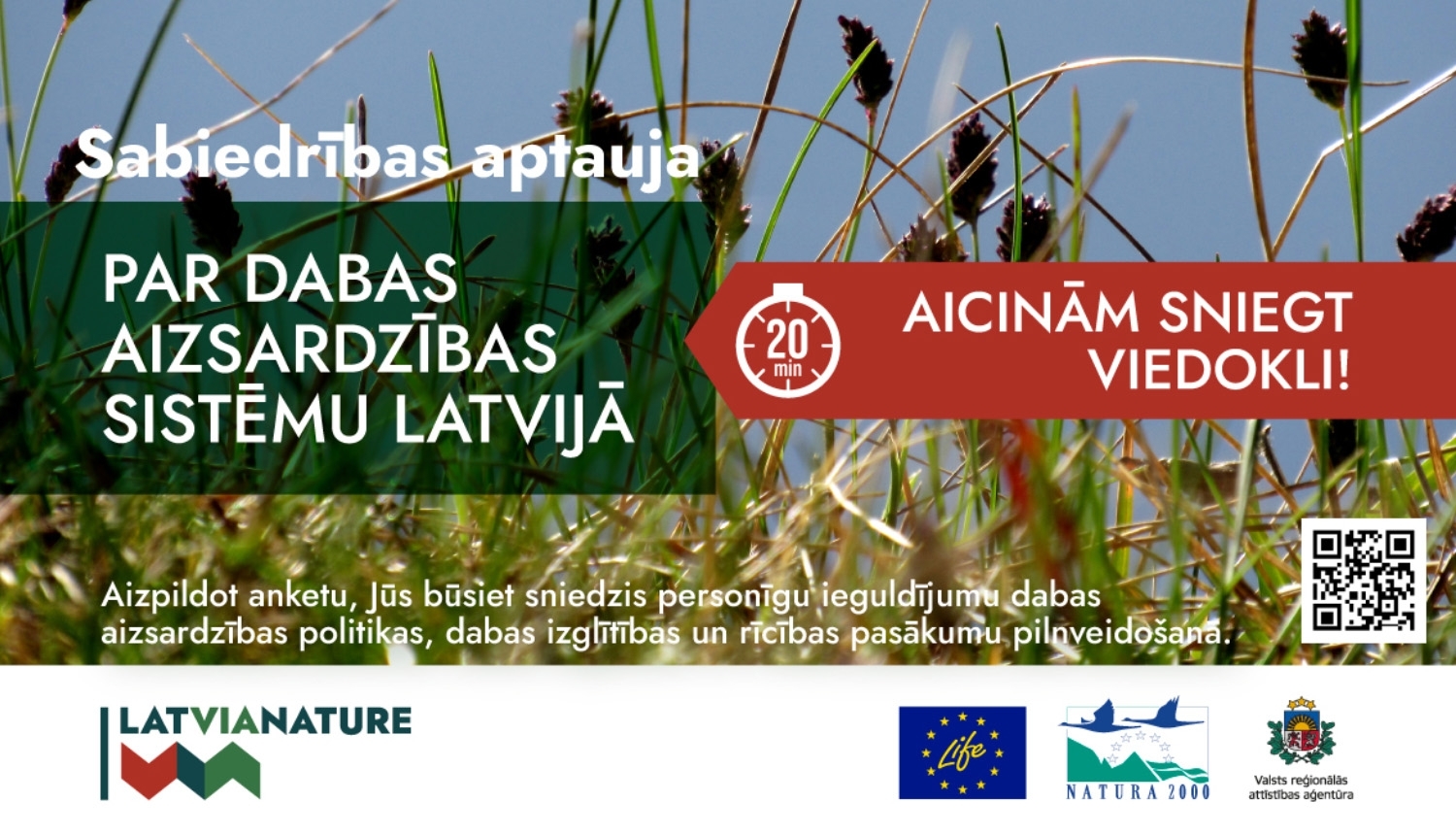 Dabas aizsardzības pārvalde projektā LatViaNature līdz 31. oktobrim aicina iedzīvotājus piedalīties sabiedrības aptaujā, lai noskaidrotu attieksmi, zināšanas un izpratni par dabas daudzveidības saglabāšanu un dabas aizsardzību Latvijā, kā arī svarīgāko par atpūtu un ceļošanu dabā. Aptaujā iespējams piedalīties tiešsaistē un tās rezultāti tiks izmantoti dabas aizsardzības politikas, dabas apsaimniekošanas un dabas izglītības pilnveidošanai.