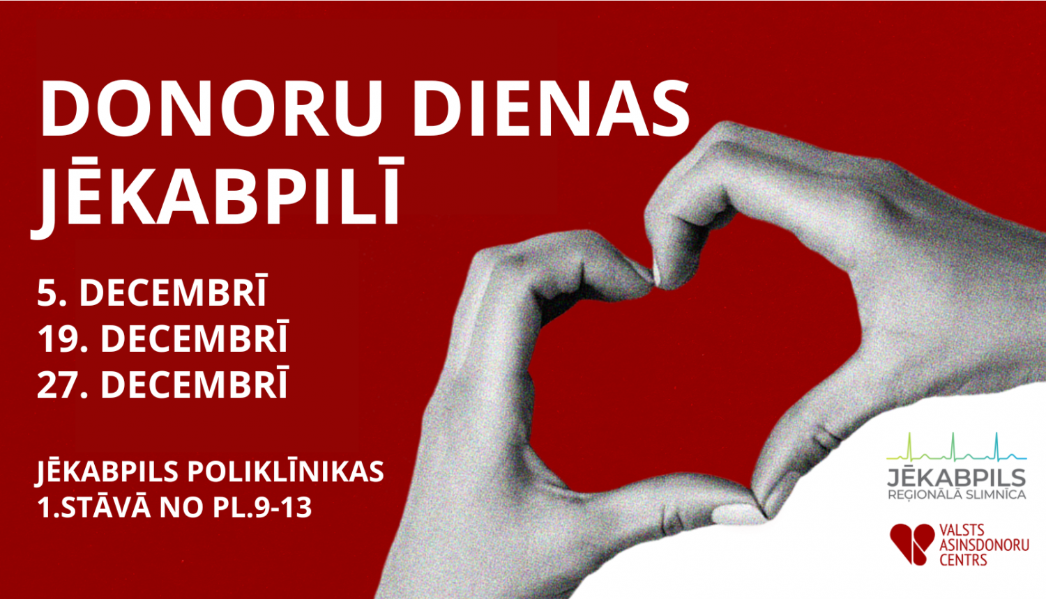 Decembrī Jēkabpils reģionālā slimnīca sadarbībā ar Valsts asinsdonoru centra Latgales filiāli organizēs trīs Donoru dienas – 5., 19. un 27.decembrī. Donoru dienas norisinās no pl.9:00-13:00 Jēkabpils reģionālās slimnīcas Ambulatorajā daļā jeb poliklīnikas ēkas 1.stāvā (ieeja no t/c “Sedumi” puses, bijušās 1.terapijas nodaļas telpas).