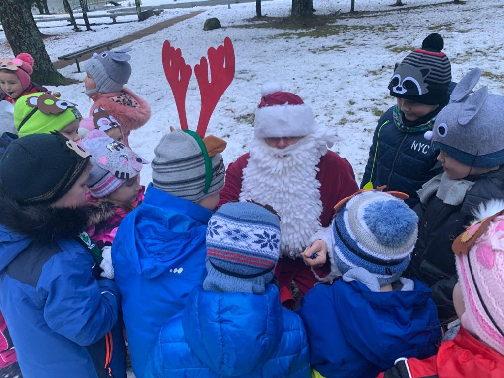 Mazākās grupiņas bērni Ziemassvētku vecīti sagaida pie bērnudārza. Lielā kupenā tiek atrasti tradicionālie svētku saldumi, ko bērni saņem, ievērojot epidemioloģiskos noteikumus.