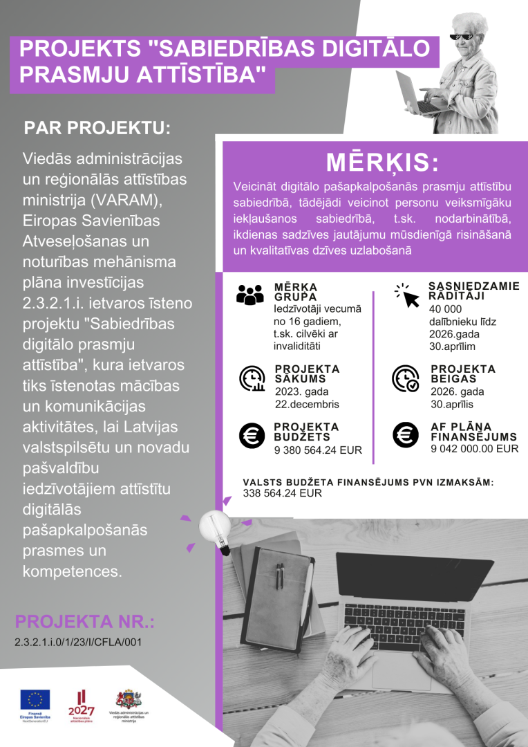 Digitālās prasmes kļūst par būtisku mūsdienu ikdienas daļu, un jēkabpilieši to aktīvi izmanto – projektā “Sabiedrības digitālo prasmju attīstība” bezmaksas mācībās līdz šim iesaistījušies jau gandrīz 100 iedzīvotāju. Projekts, ko īsteno Viedās administrācijas un reģionālās attīstības ministrija (VARAM), sadarbībā ar Jēkabpils novada pašvaldību, palīdz apgūt gan pamata, gan praktiskas digitālās iemaņas, kas atvieglo ikdienu – ļauj veikt maksājumus, pierakstīties pie ārsta, neizejot no mājām, un sazināties ar valsts iestādēm tiešsaistē.