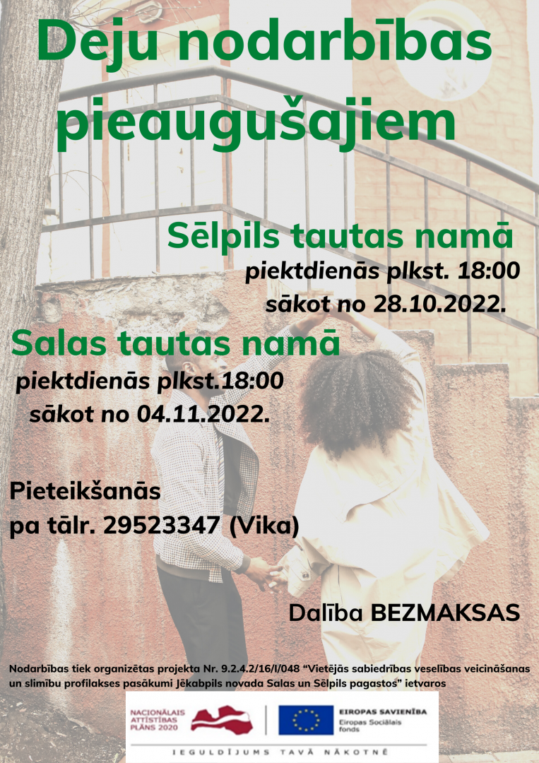 Jēkabpils novada iedzīvotāji aicināti apmeklēt deju nodarbību ciklu Sēlpils un Salas pagastā, kas norisināsies projekta Nr. 9.2.4.2/16/I/048 ”Vietējās sabiedrības veselības veicināšanas un slimību profilakses pasākumi Jēkabpils novada Salas un Sēlpils pagastos” ietvaros.