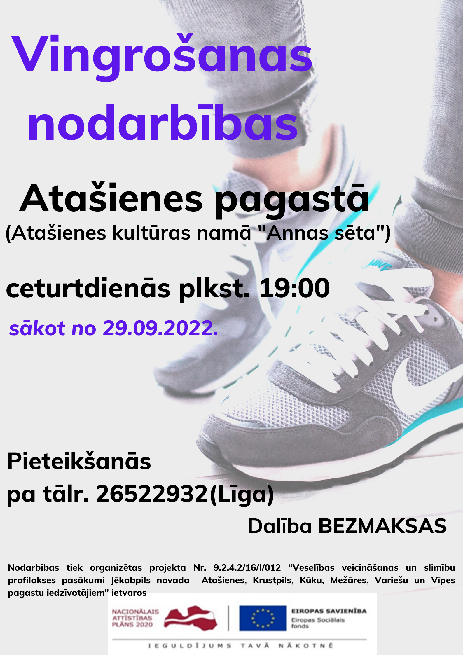 Dalība nodarbībās bez maksas. Uz nodarbībām aicināts ierasties ērtā un fiziskām aktivitātēm piemērotā apģērbā.