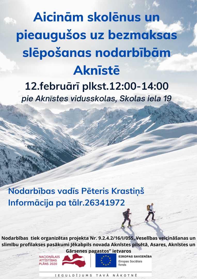 12. februārī no plkst. 12.00 līdz 14.00 aicinām skolēnus un pieaugušos uz bezmaksas slēpošanas nodarbībām Aknīstē. Pulcēšanās pie Aknīstes vidusskolas, Skolas ielā 19.