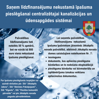 Sīkāka informācija: Par Jēkabpils novada pašvaldības līdzfinansējumu nekustamā īpašuma pieslēgšanai centralizētajai kanalizācijas un ūdensapgādes sistēmai (likumi.lv)