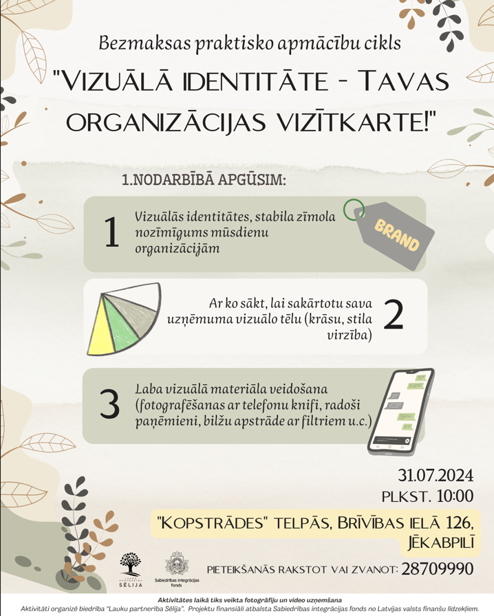 Biedrība “Lauku partnerība Sēlija”, projekta “Vienoti abos Daugavas krastos” (identifikācijas Nr. 2024.LV/NVOF/MIC/016) ietvaros, uzsāk praktisko apmācību ciklu “Vizuālā identitāte - Tavas organizācijas vizītkarte!”, sadarbībā ar Jēkabpils novada pašvaldību. Pirmā apmācību nodarbība notiks jau 31.jūlijā, plkst. 10:00, “Kopstrādes” telpās, Brīvības ielā 126, Jēkabpilī.