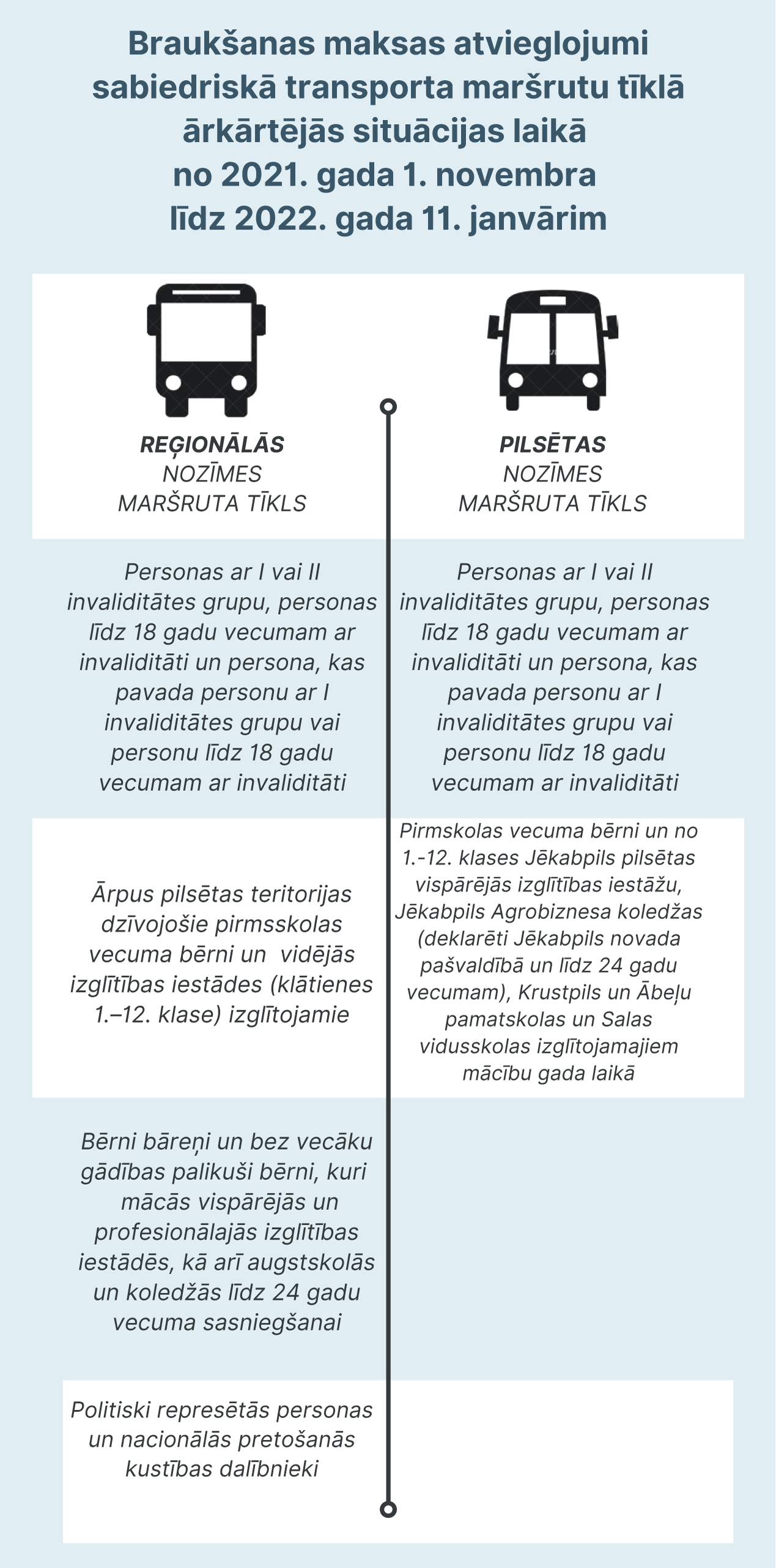 Lai novērstu privātpersonu veselības apdraudējumu un veicinātu Covid-19 infekcijas izplatības pārvarēšanu, Jēkabpils novada pašvaldība lēmumā Nr. 343 “Par braukšanas maksu un atvieglojumu piešķiršanu Jēkabpils pilsētas nozīmes maršrutos” ir apstiprināti braukšanas maksas atvieglojumu ierobežojumi, kas paredz ārkārtas situācijas laikā braukšanas maksas atvieglojumu piemērošanu pirmsskolas, vispārējās un profesionālās izglītības iestāžu izglītojamiem.