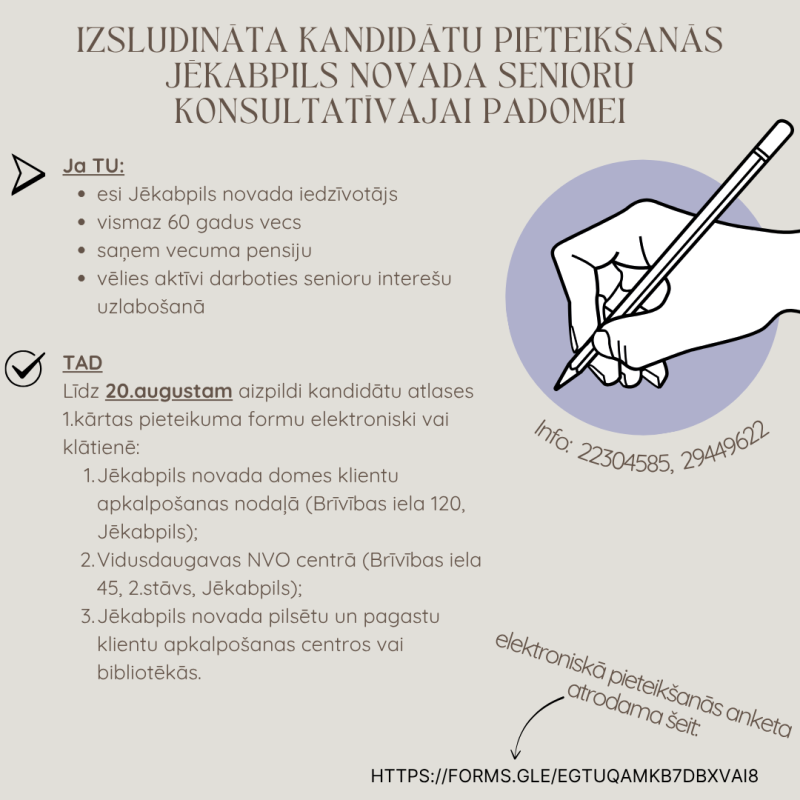 Lai izvirzītu savu kandidatūru darbam Senioru konsultatīvajā padomē tiek izsludināta atlases 1. kārta - pieteikumu iesniegšana.