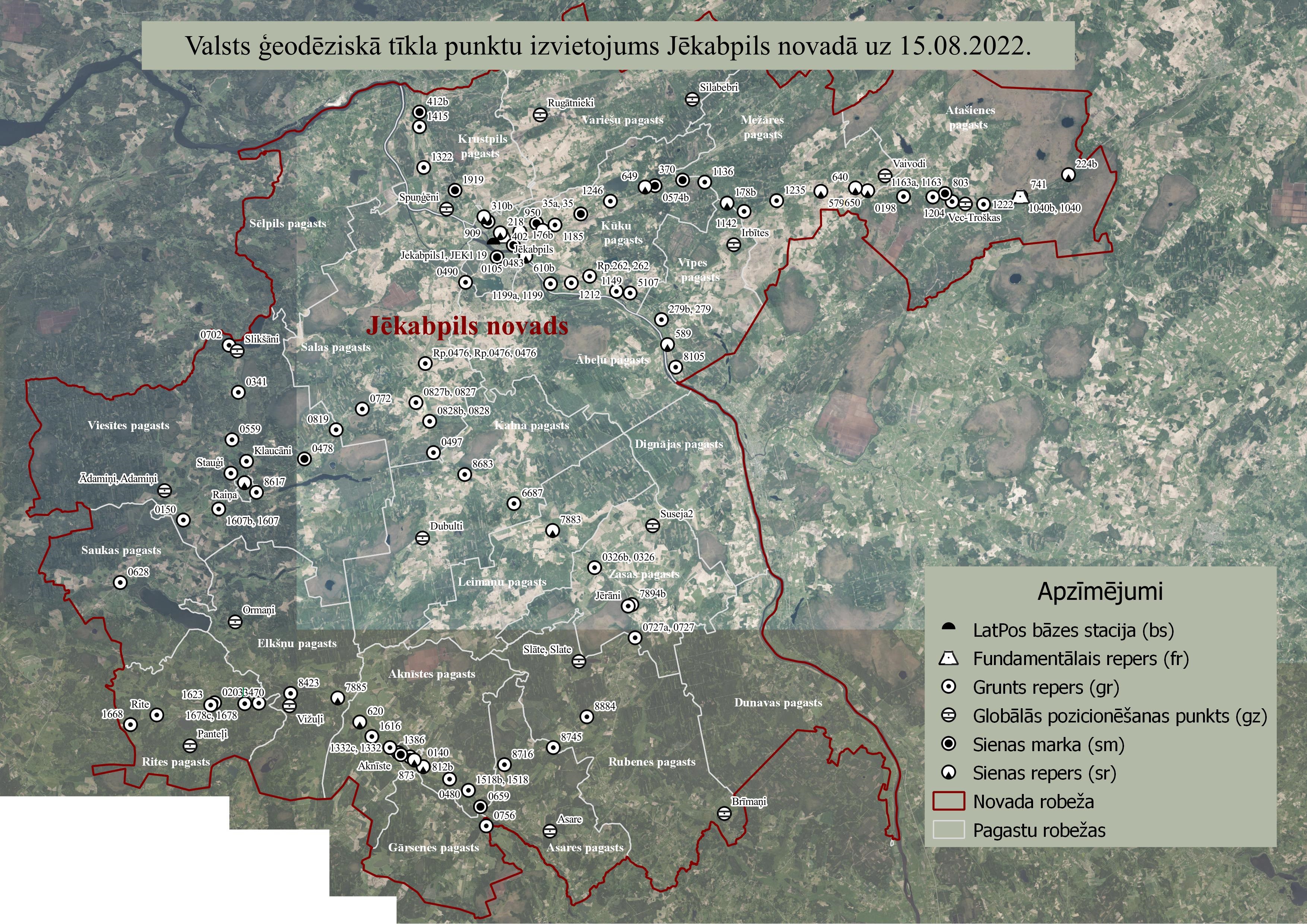 2022. gada augustā Latvijas Ģeotelpiskās informācijas aģentūras (turpmāk - Aģentūra) darbinieki ir uzsākuši valsts ģeodēziskā tīkla punktu apsekošanas un sakārtošanas darbus Daugavas kreisā krasta novados. Jēkabpils novadā apsekos valsts ģeodēziskā tīkla punktus Aknīstē, Viesītē, Aknīstes, Ābeļu, Asares, Elkšņu, Gārsenes, Kalna, Leimaņu, Rites, Rubenes, Salas, Saukas, Viesītes un Zasas pagastos.
