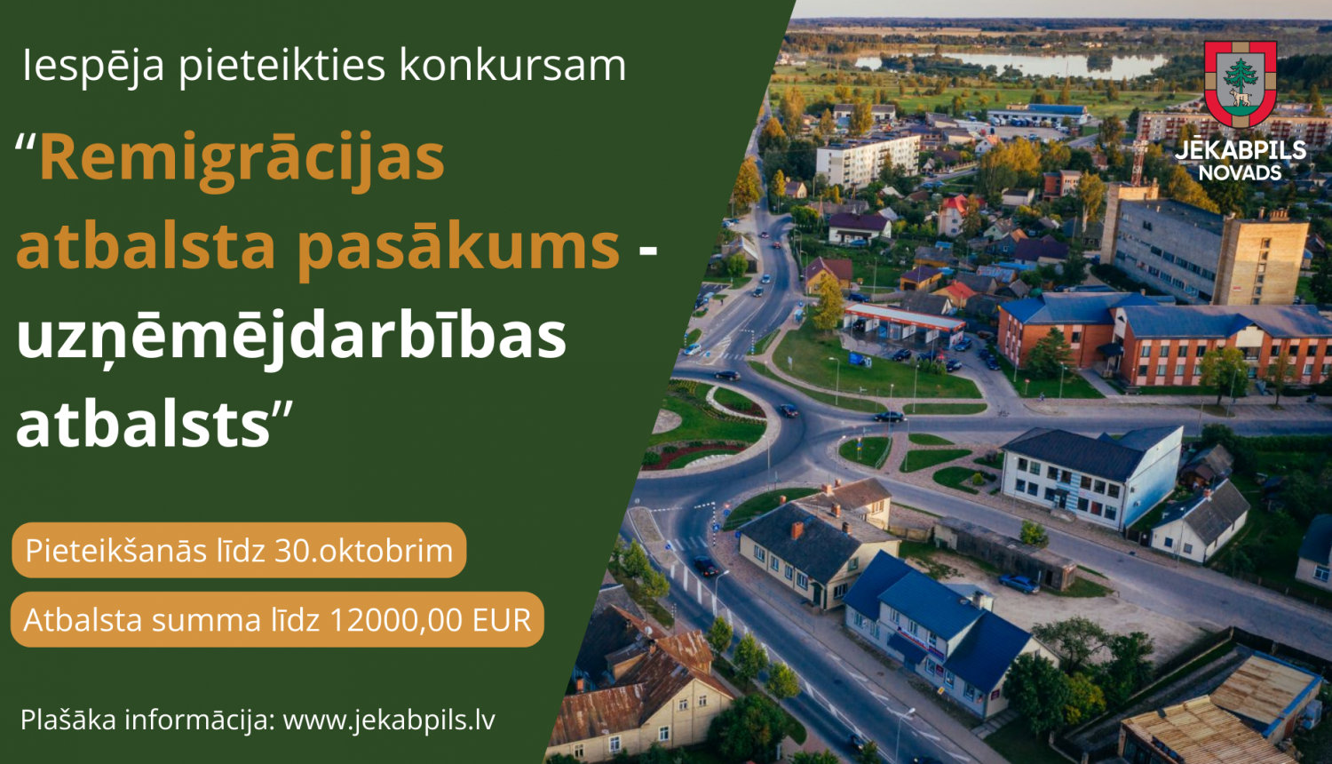 Lai veicinātu iedzīvotāju vēlmi atgriezties Latvijā, Jēkabpils novada pašvaldība sadarbība ar Zemgales plānošanas reģionu un Vides aizsardzības un reģionālās attīstības ministrijas atbalstu atkārtoti organizē konkursu „Remigrācijas atbalsta pasākums – uzņēmējdarbības atbalsts”. Projektu pieteikumus atbalsta saņemšanai var iesniegt no 2024. gada 30. jūlija līdz 2024. gada 30. oktobrim plkst. 23.59.