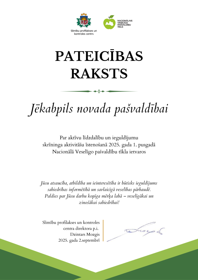 Jēkabpils novada pašvaldība saņēmusi Slimību profilakses un kontroles centra Pateicību par aktīvu iesaisti Nacionālā Veselīgo pašvaldību tīkla iniciatīvās.