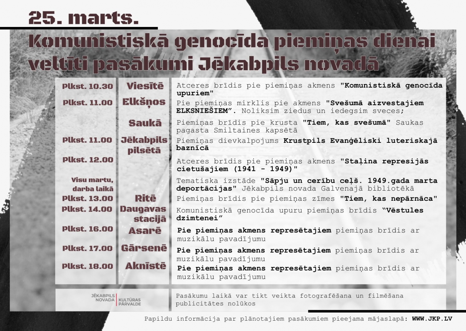 25. martā pasākumi represijās cietušajiem norisinās arī citviet Jēkabpils novadā. Aicinām uz mirkli apstāties, pakavēties atmiņās un pieminēt tos tautiešus, kuru sapnis par Latviju palika tur, Sibīrijas plašumos...